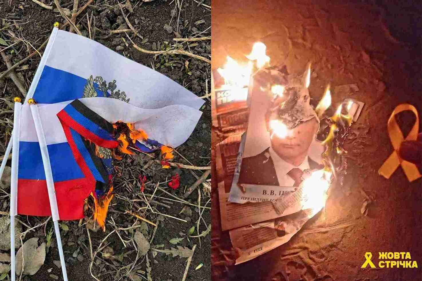 Знищення російської символіки та пропагандистських газет на тимчасово окупованих територіях України. Фото: “Жовта Стрічка”