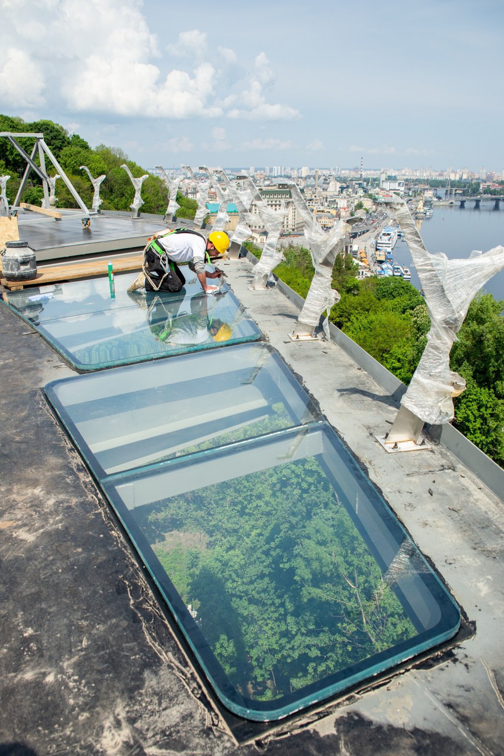 На оглядових столичного пішохідно-велосипедного мосту запроектовано часткове застосування скла для підлоги. Цей міст розташований між парками "Хрещатий" та "Володимирська гірка".