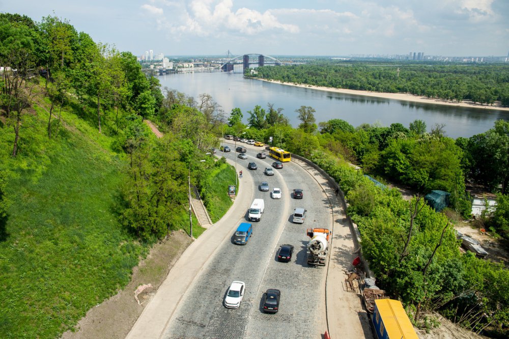 В місцях зміни напрямків мосту влаштовані оглядові майданчики, звідки розкриваються панорами лівобережжя та Подолу.