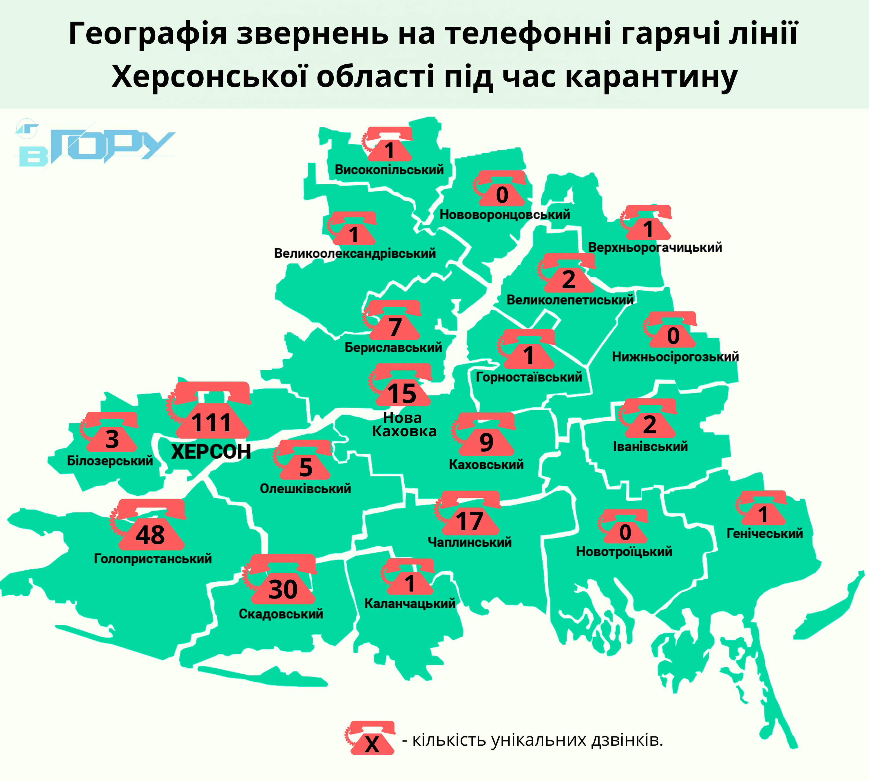 “З 15 квітня по 15 липня на телефонні гарячі лінії надійшло 317 дзвінків та запитів на консультації. Серед них 256 - це унікальні клієнти. Від жінок надійшло 75 % всіх дзвінків, від чоловіків - 25 %. Найбільше дзвінків отримали з Херсона (111, це 43 % всіх дзвінків), Голопристанський район - 48 дзвінків (це майже 20 %), Скадовський район - 30 (майже 12%), Чаплинський район - 17 (майже 7%). У цих районах працювали консультанти з місцевих організацій, які систематично розповсюджували інформацію, а самих їх добре знають місцеві, тому вони мають неабияку довіру в громадах”, - проінформувала Наталі Дорофєєва.