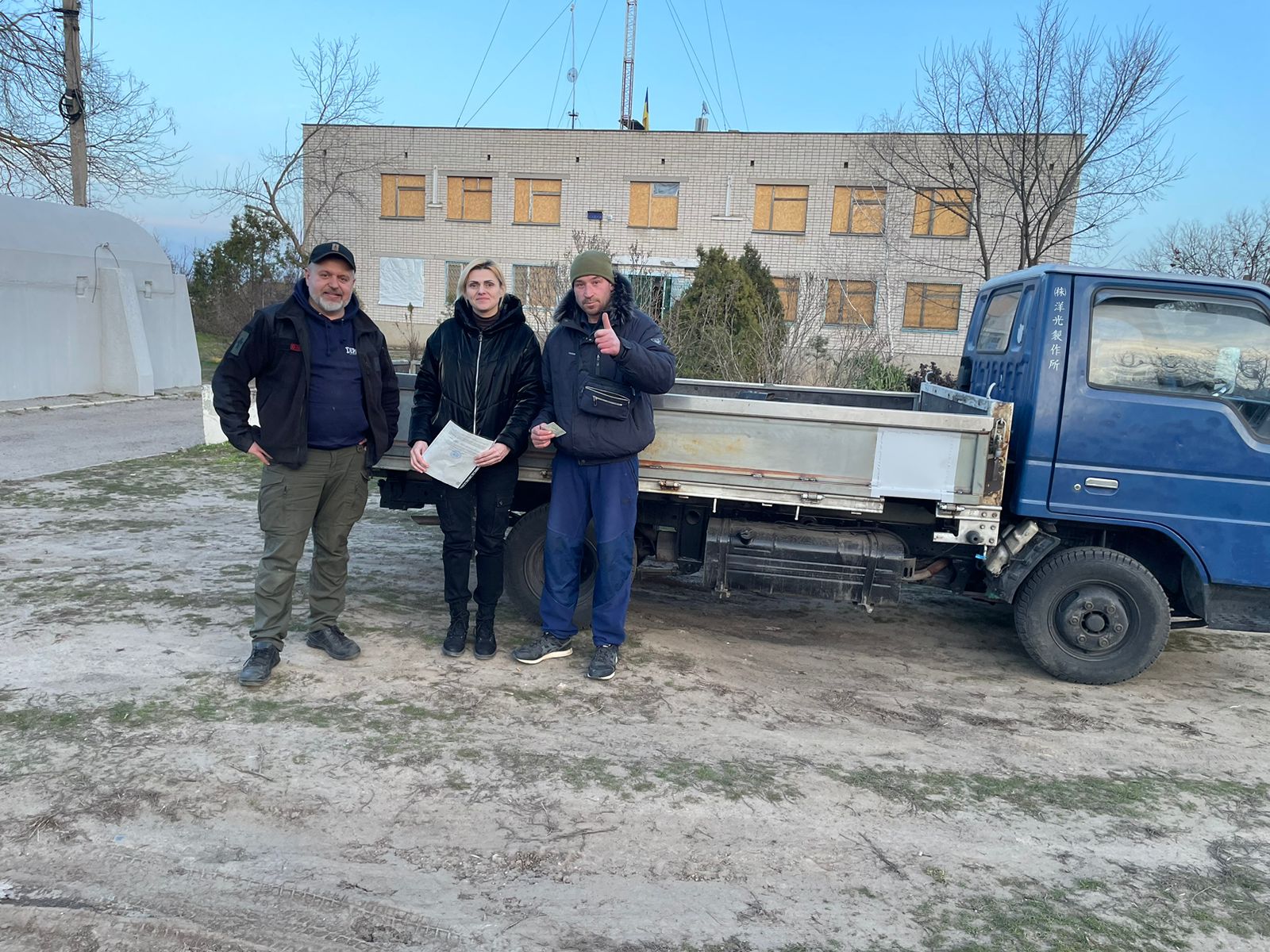 Олена Семеніхіна з волонтером і охоронцем біля приміщення старостату