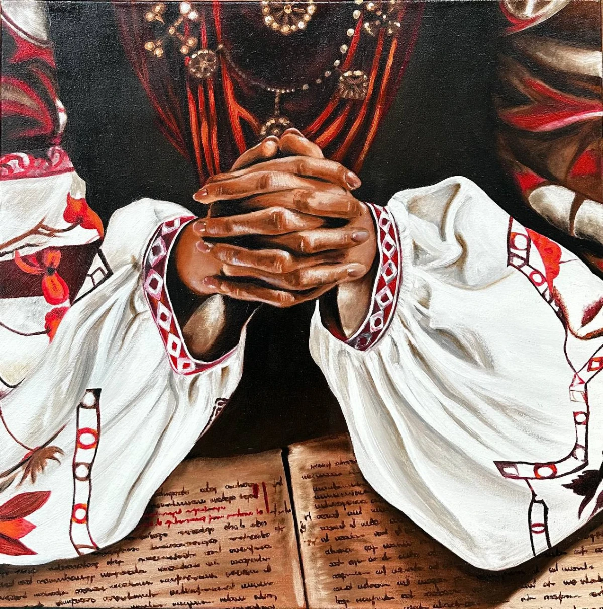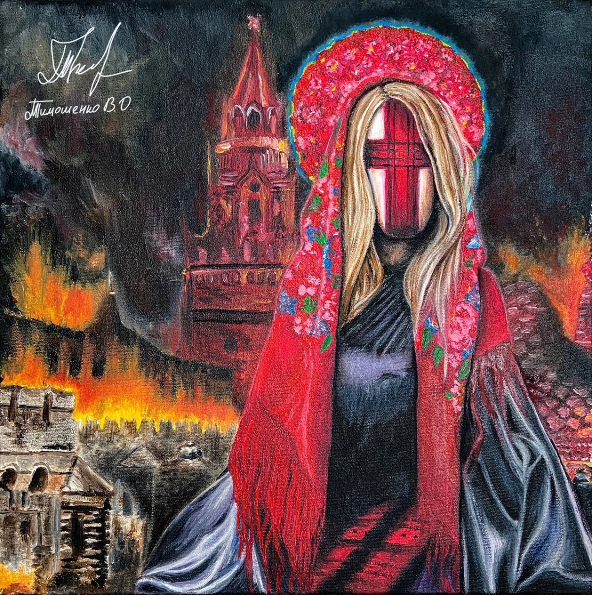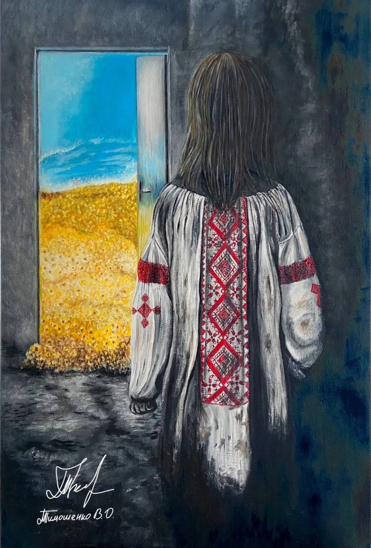 Вона почала знову писати картини інакше, ніж раніше. Одна з перших робіт – дівчина, яка тоне у темряві. Потім була дівчинка з колоссям, згодом портрет доньки, який закопали в Олешках, щоб заховати від окупантів. Ще вона не встигла завершити роботу з жінкою, яка обіймає військового, бо у місто вже увірвалися окупаційні війська.
