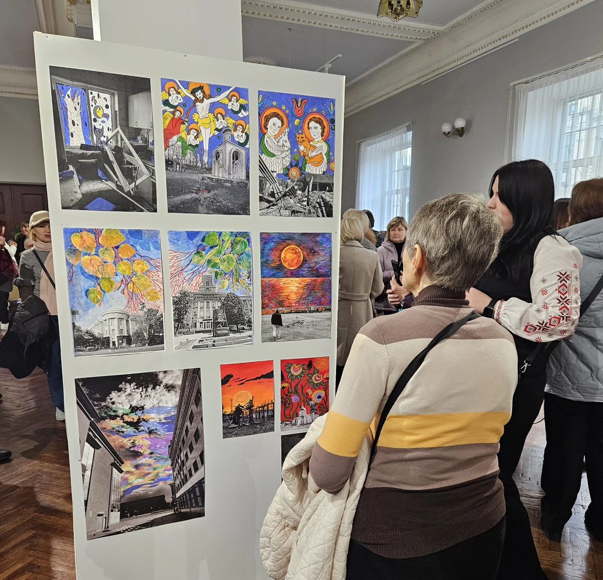 Організатори виставки ІРЦ «Правовий простір» і Центр культурного розвитку «Тотем» представили на виставці понад 150 робіт – малюнків неба над Херсоном, створених поверх чорно-білих фотографій зруйнованих будівель.