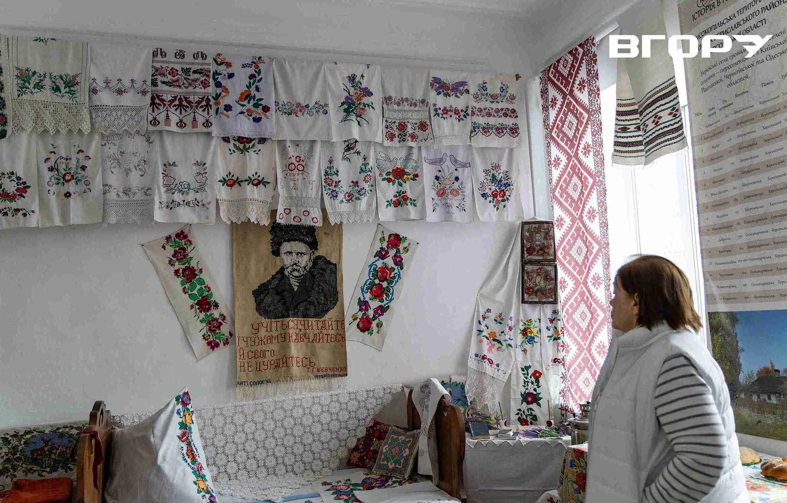 Зберігачка фондів Високопільського краєзнавчого музею Любов Куцевол показує журналістам Вгору колекцію рушників.