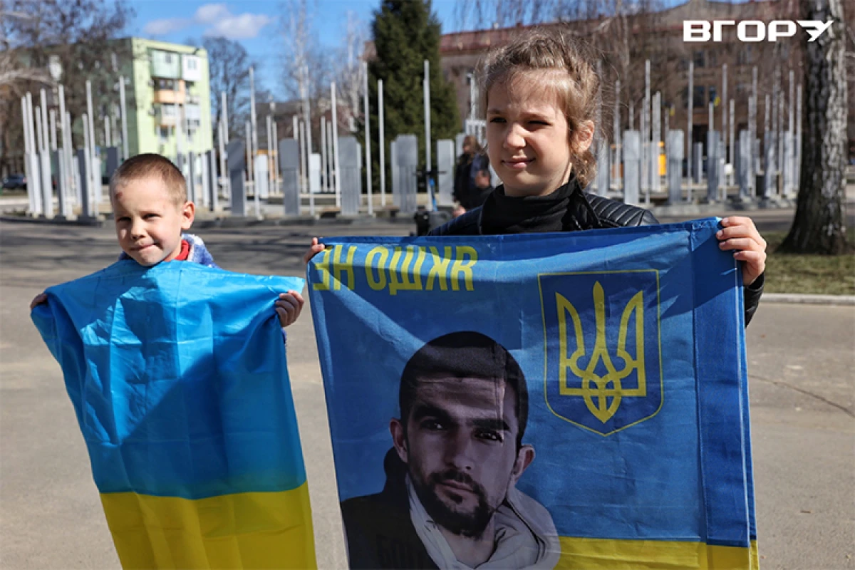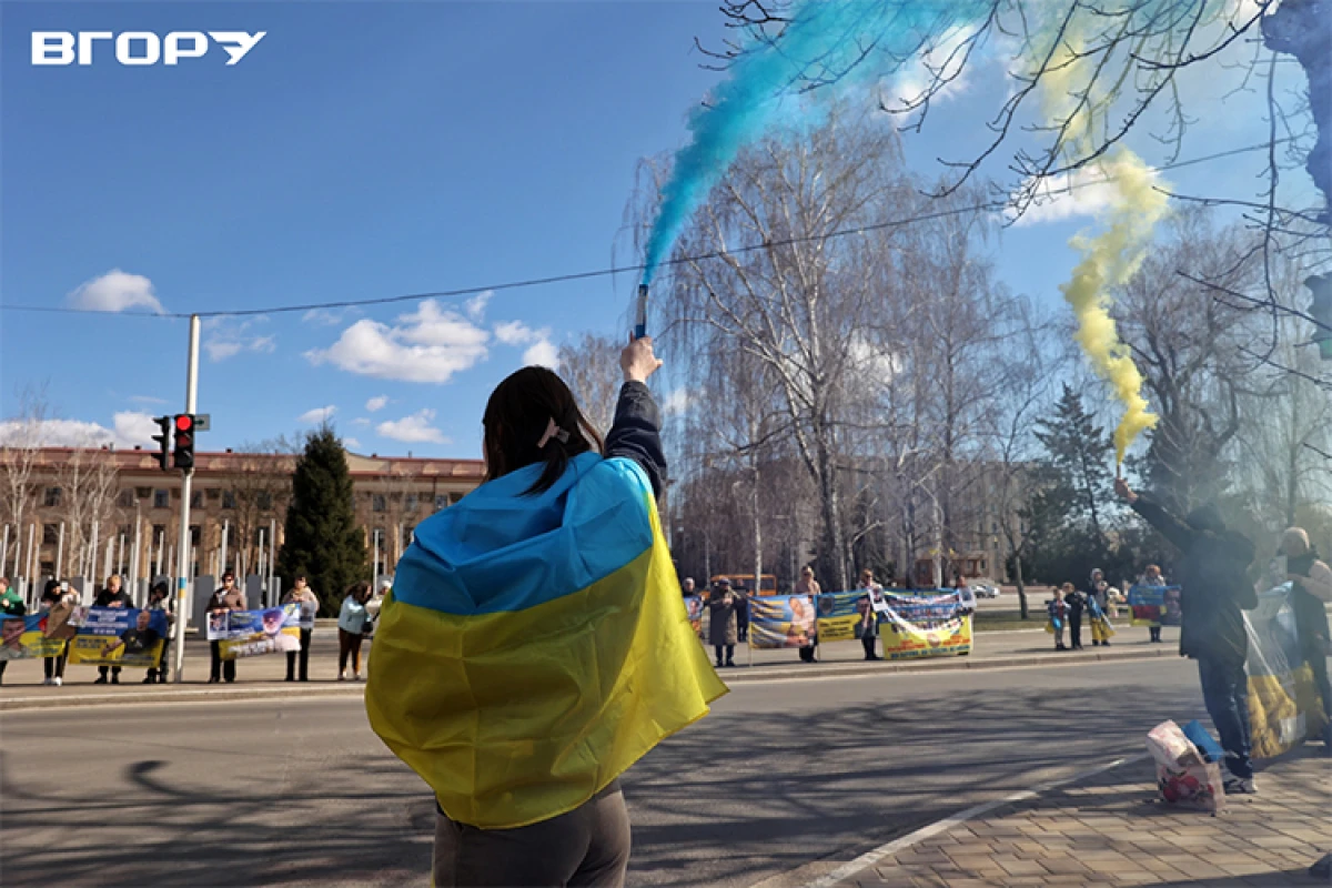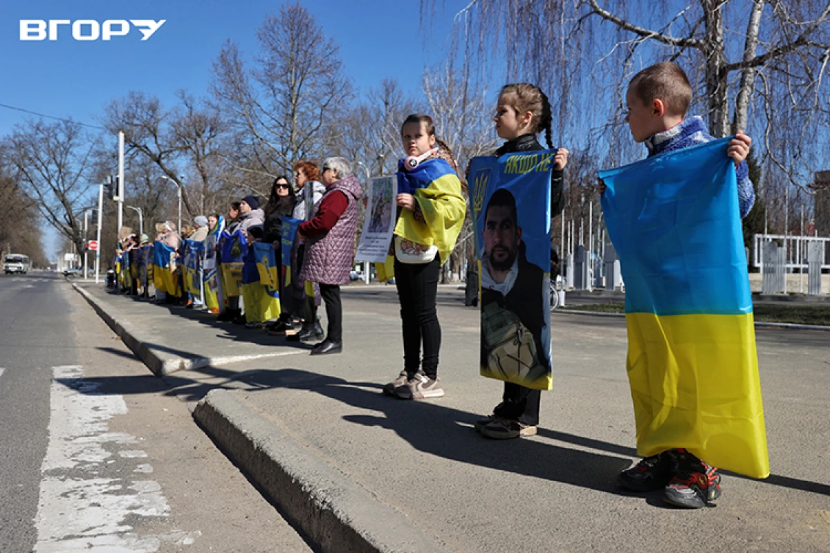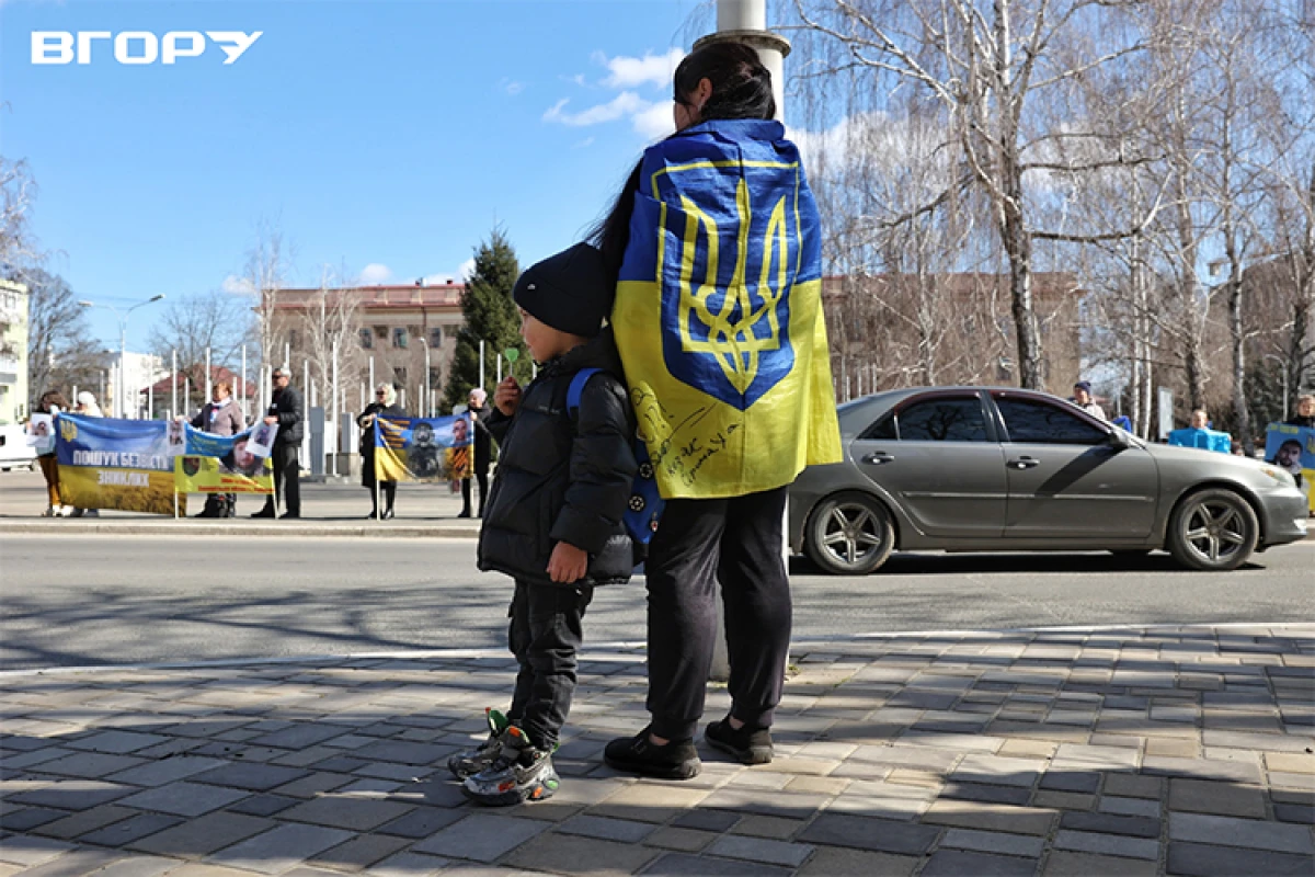 Поруч із натовпом стоїть літня жінка з жовто-блакитним прапором, на якому написано: “Пошук безвісти зниклих”. Біля її ніг притискається маленька дівчинка, час від часу відволікаючись на машини, що проїжджають повз. Поряд – плакат із фотографією чоловіка і написом: “Карачебан Микола Ілліч. Зник 30.01.2026. н.п. Зелене, Запорізька область”.