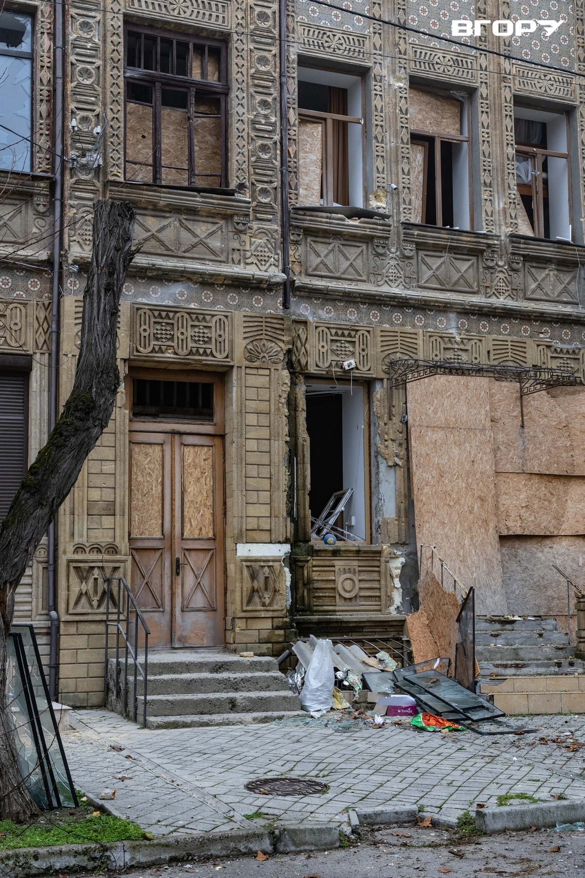 На фото з місця обстрілу видно, що пошкоджені будівлі в стилі німецького модерну, будинок Перуанських купців, а також будівлю ДРАЦСу.