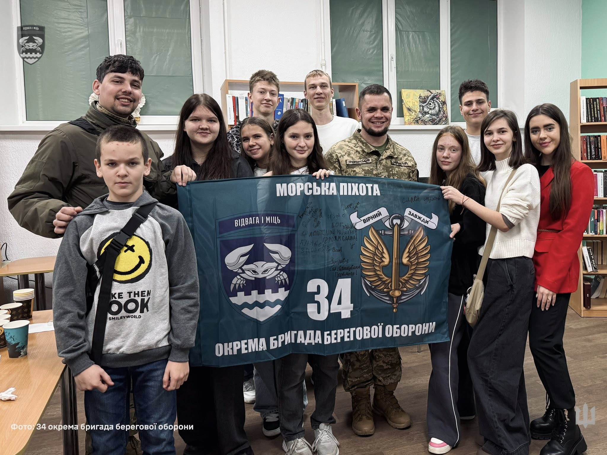 У відповідь військові передали новоствореній дитячій студії відзнаку та бригадний прапор. Також вони попросили маленьких творців залишити свої підписи на іншому прапорі, який розмістять у командному пункті підрозділу.