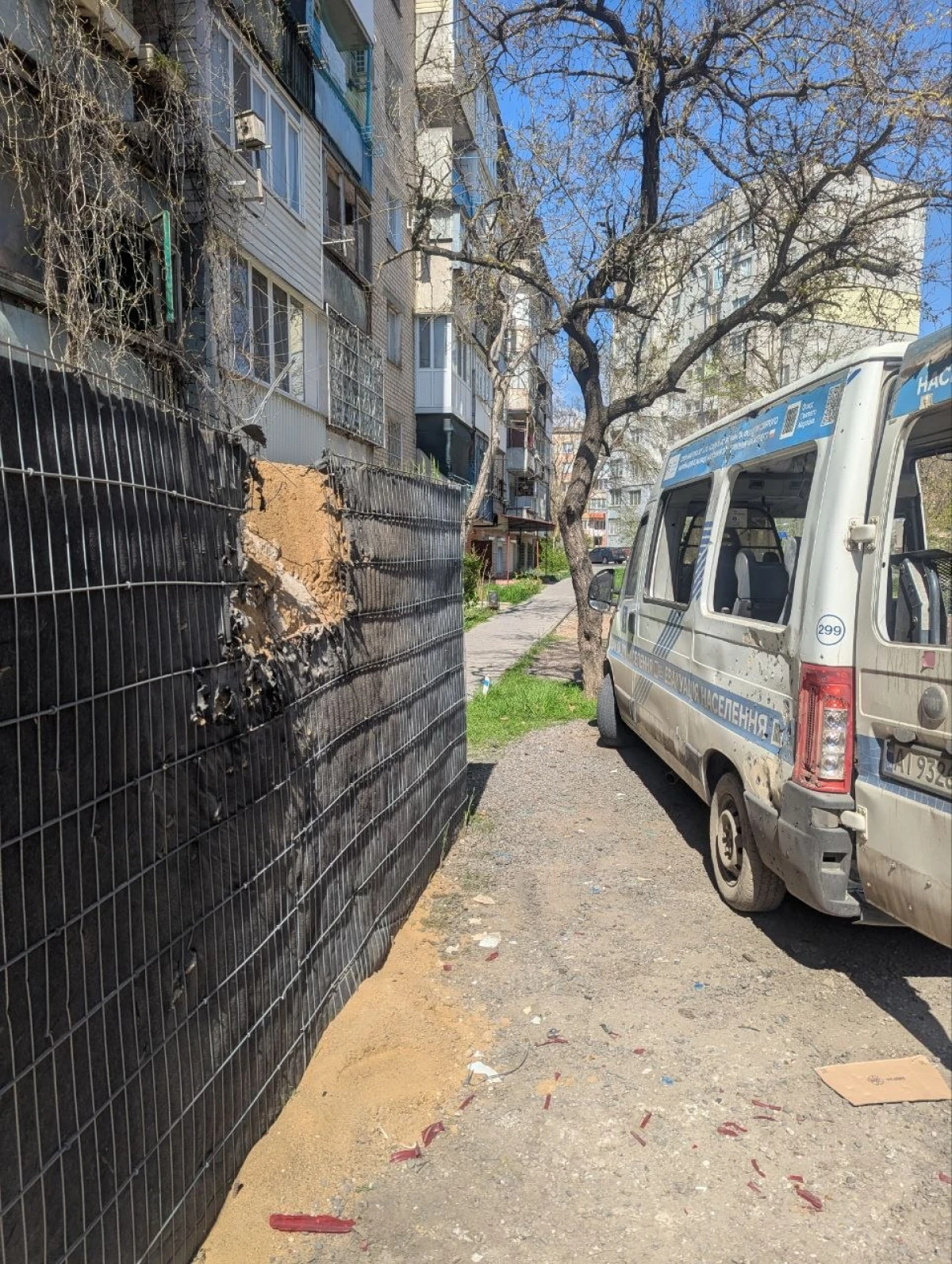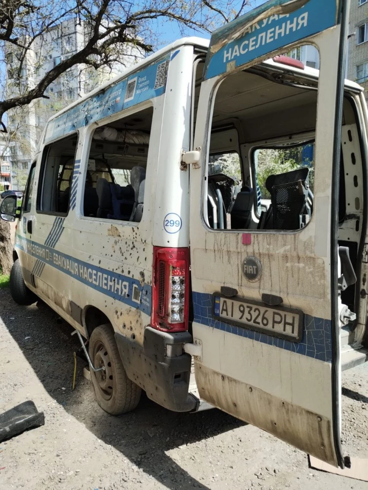 Російський дрон 15 квітня атакував евакуаційну автівку та соціальне таксі в Херсоні. У цей момент команда волонтерів чекала на виїзд, але людей у транспорті не було, тому ніхто не постраждав.