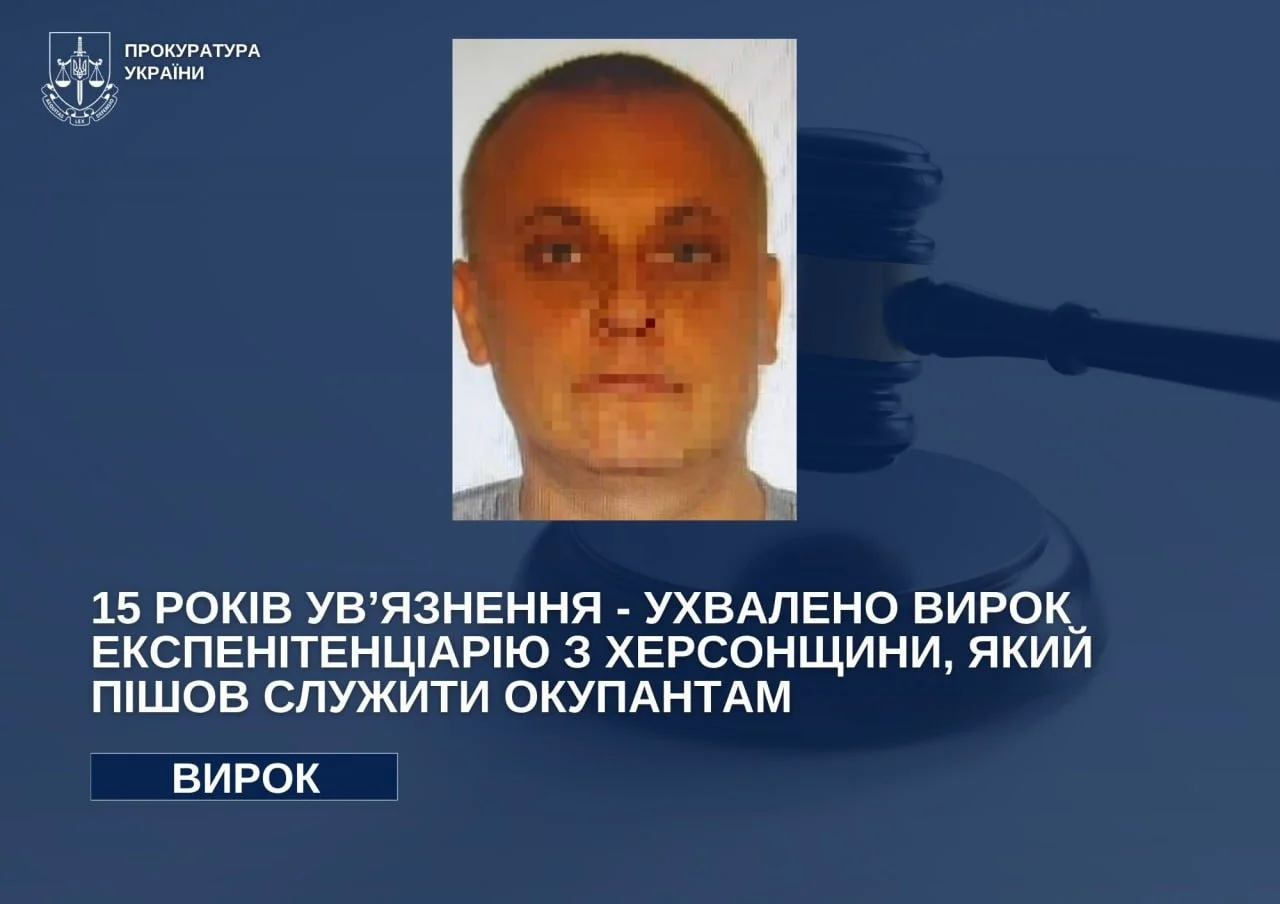 Прокурори довели, що засуджений — експолковник внутрішньої служби, який до повномасштабного вторгнення працював у Північній виправній колонії. У травні 2022 року він почав співпрацювати з російськими військовими та обійняв посаду незаконного начальника відділу режиму й нагляду в окупаційному управлінні служби виконання покарань по Херсонській області.