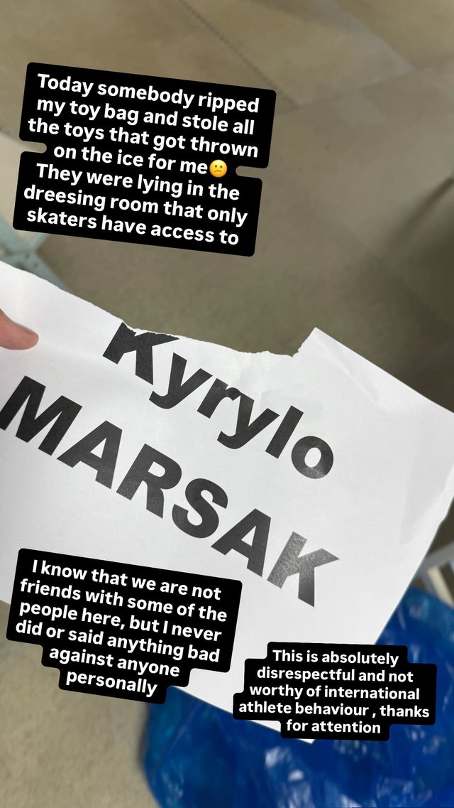 "Мова не про іграшки, а про те, що це сталося в роздягальні, яка вважається "безпечним місцем". Там же були мої ковзани й костюм. На щастя, з екіпіровкою нічого не сталося. Дуже сумніваюся, що це зробив хтось із нейтральних спортсменів!".