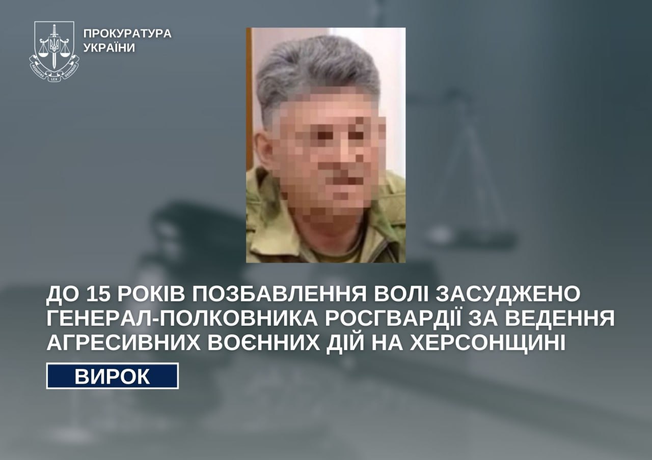 Генерал-полковника Росгвардії визнали винним у веденні агресивних воєнних дій на Херсонщині й засудили до 15 років позбавлення волі.