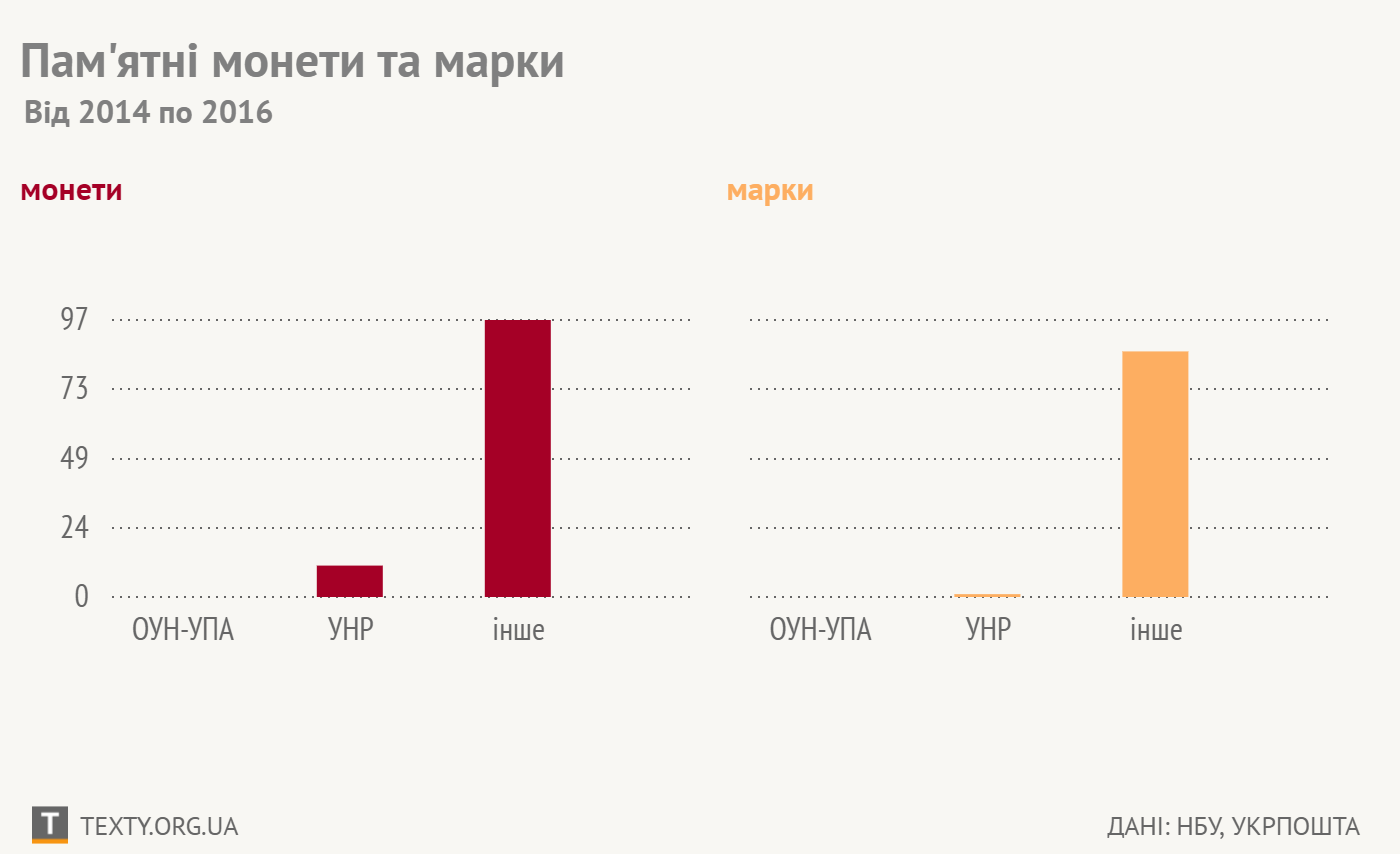 У 2014-2016 роках Національний банк України випустив 108 пам’ятних монет. Укрпошта випустила за той самий час 87 художніх марок. Тематиці Української революції присвячено 11 монет і 1 марка (до 150-річчя Михайла Грушевського). На сайтах НБУ або Укрпошти не вдалося знайти жодної монети або марки 2014-2016 років, які б були присвячені Бандері, ОУН або УПА.