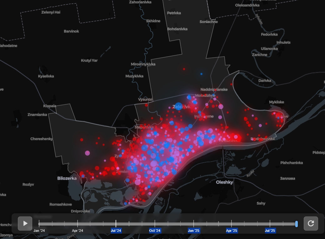 Херсон, де зараз проживає близько 71 тисячі людей, розділений річкою Дніпро. Південний берег контролюють російські війська, тоді як цивільні мешкають на північному. Саме сюди щодня запускають дрони, які без розбору калічать і вбивають людей, йдеться у поясненні авторів карти.
