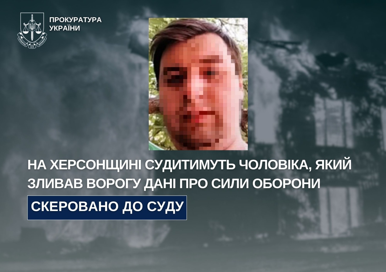 Херсонська обласна прокуратура направила до суду обвинувальний акт щодо місцевого жителя. Його підозрюють у поширенні інформації про переміщення, рух і розташування Збройних сил України.