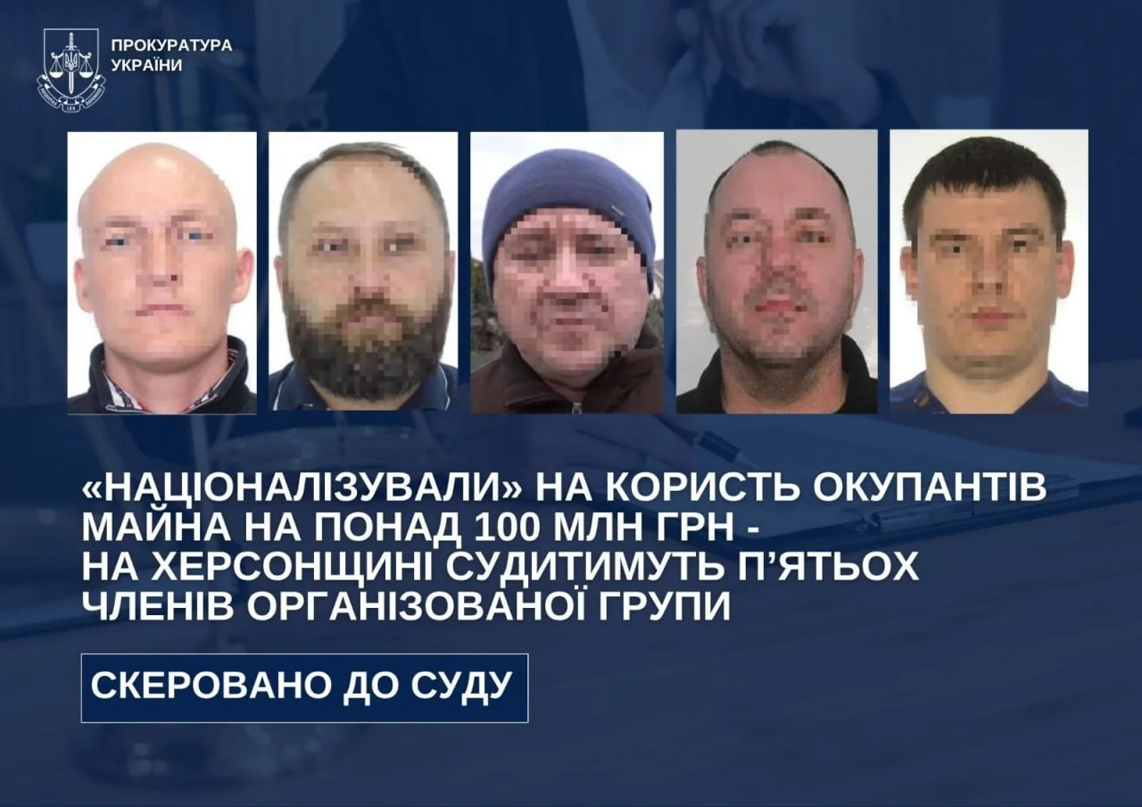 Прокурори скерували до суду обвинувальний акт щодо п’ятьох жителів Херсонської області. Їх обвинувачують у колабораційній діяльності та пособництві державі-агресору, вчинених організованою групою.