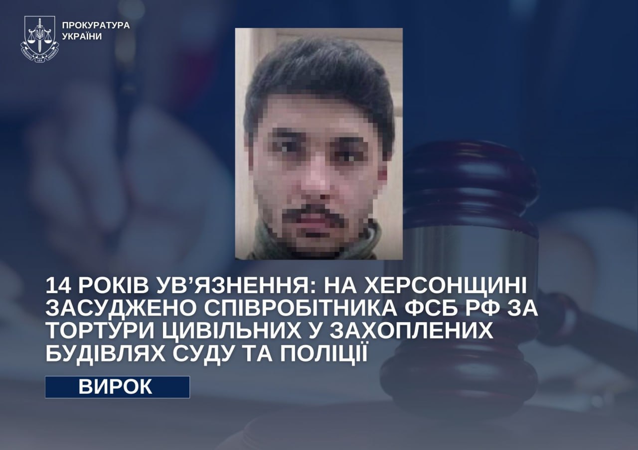 На Херсонщині суд визнав винним 31-річного громадянина РФ, співробітника ФСБ, у жорстокому поводженні з цивільним населенням. Йому призначили 14 років позбавлення волі.