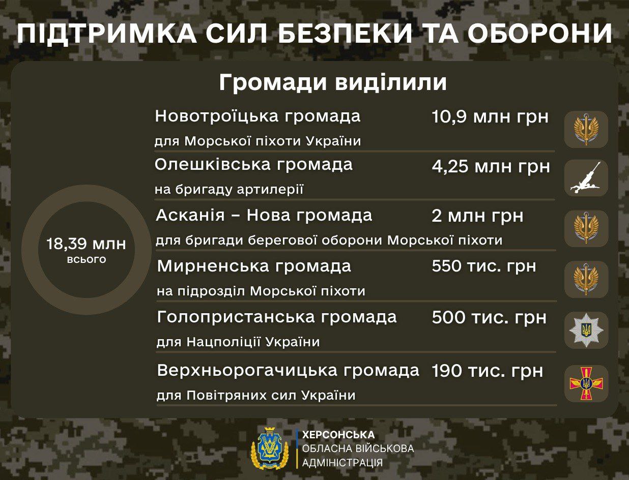 З 3 по 9 листопада для підтримки Сил безпеки та оборони, які працюють на Херсонщині виділили 18 мільйонів 390 тисяч гривень із бюджетів громад області.