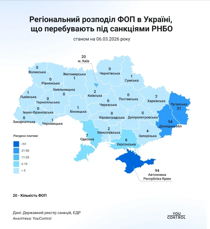 Загалом у Державному реєстрі санкцій Ради національної безпеки і оборони України є 217 людей, зареєстрованих в Україні як фізичні особи-підприємці. Більшість із них перебувають на тимчасово окупованих територіях.