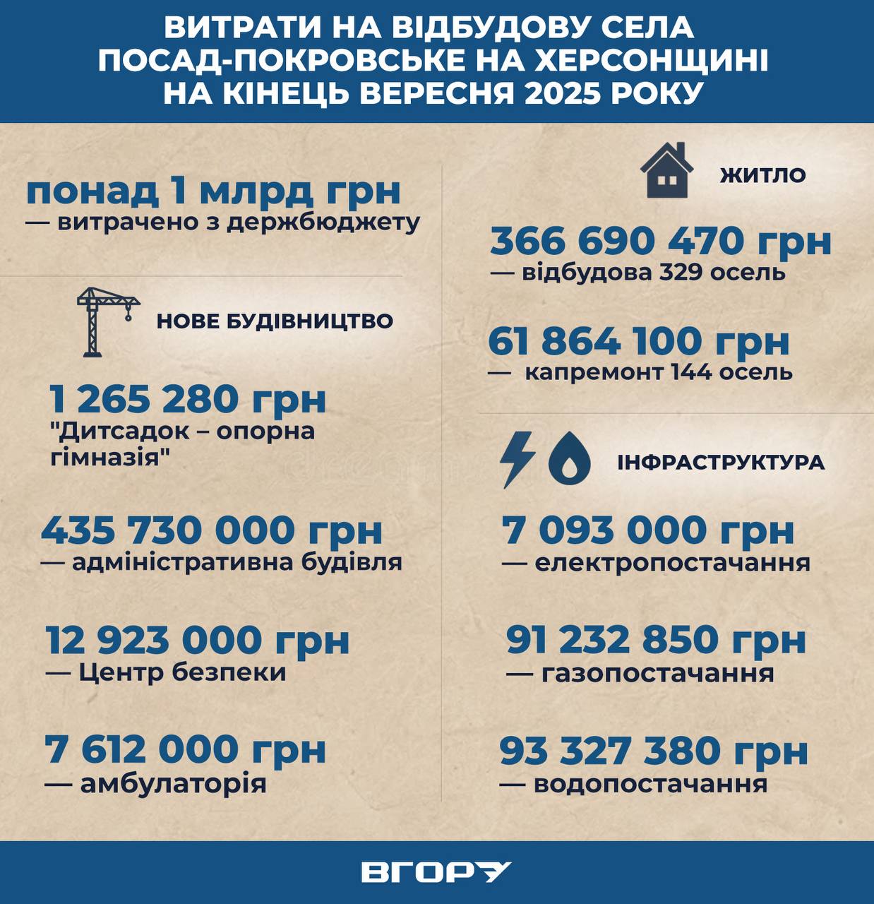 На 25 вересня 2025 року на відбудову села Посад-Покровське Херсонської області витратили з фонду ліквідації наслідків збройної агресіїЦе бюджетна програма, спрямована на відбудову, посилення захисту критичної інфраструктури та компенсації людям, чиє житло пошкоджене або зруйноване внаслідок російської збройної агресії. 1 мільярд 98 мільйонів 888 тисяч 62 гривні.