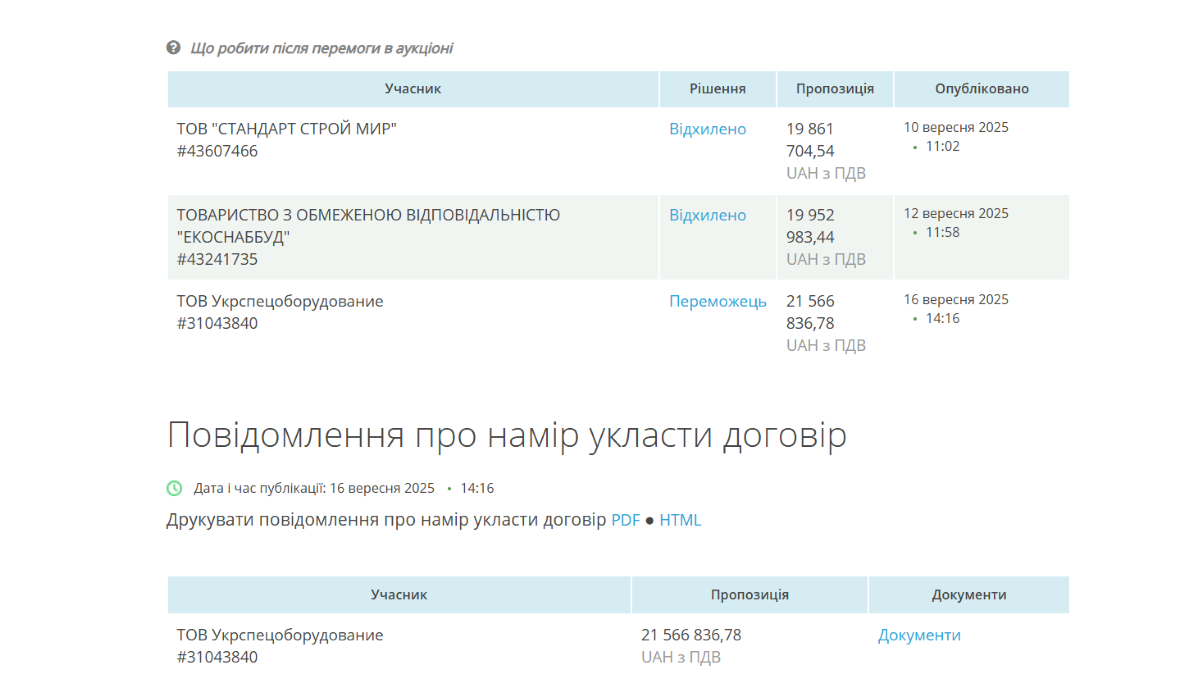 Проте 8 вересня на аукціон пропозиції подали три компанії: ТОВ "Стандарт строй мир", ТОВ "Екоснаббуд" та ТОВ "Укрспецоборудование".