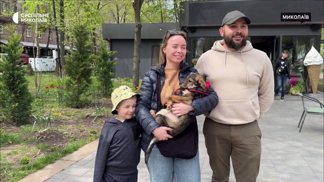 Родина з Херсона, яка прилаштувала одного з собак з Херсонщини. Скриншот: Суспільне Миколаїв