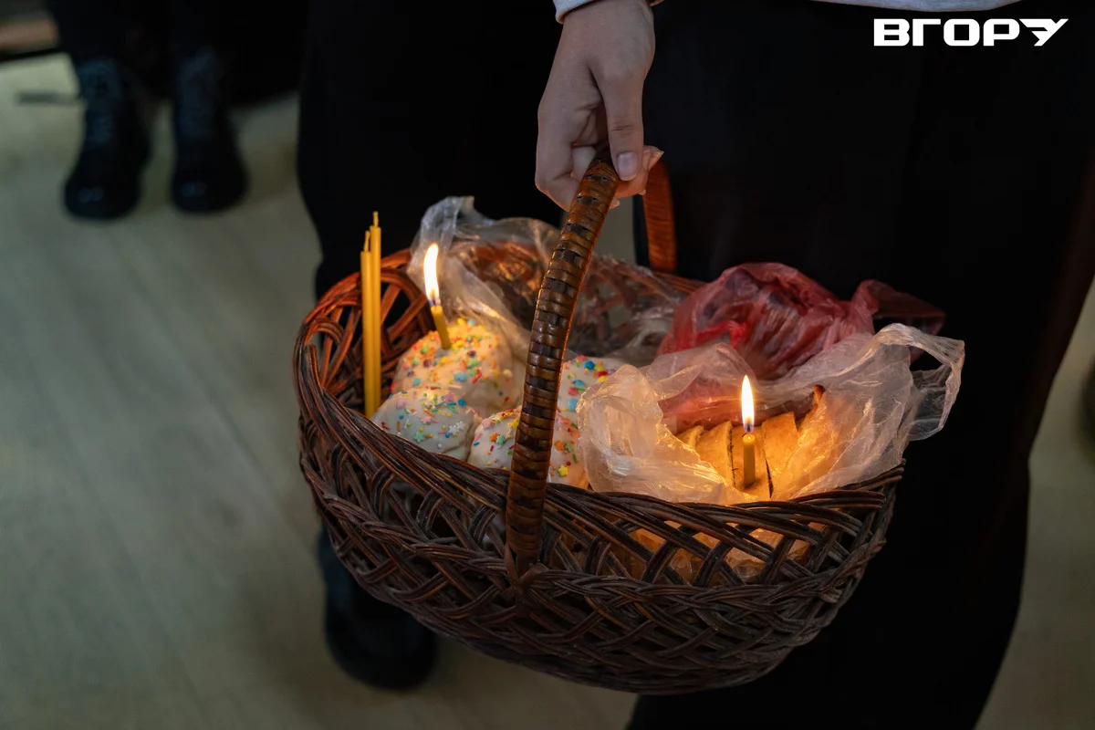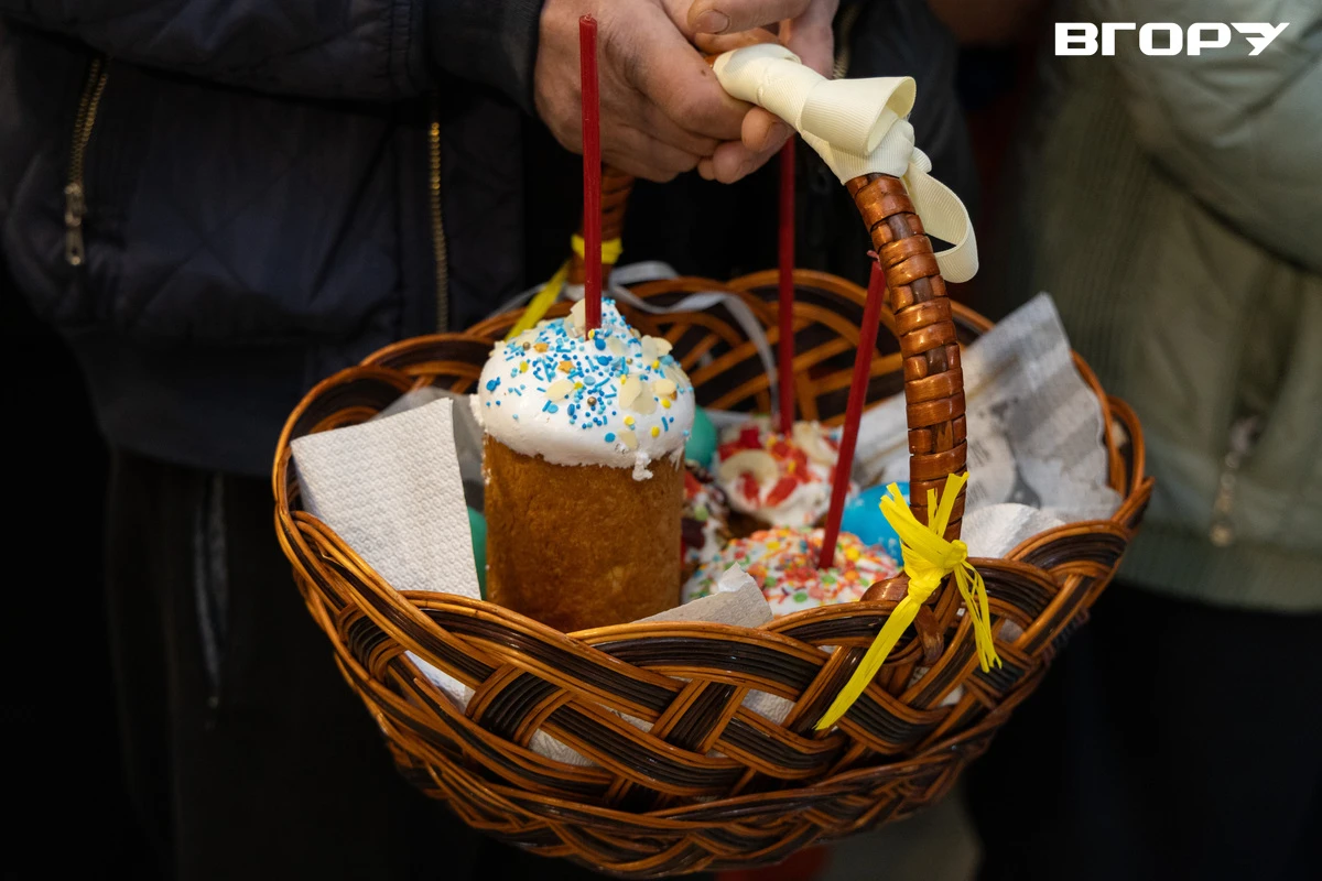 Люди приносили для освячення Великодні кошики, прикрашені рушниками, квітами й стрічками. У них були паски, крашанки, писанки, м’ясні вироби, сир, овочі, зелень та свічки.