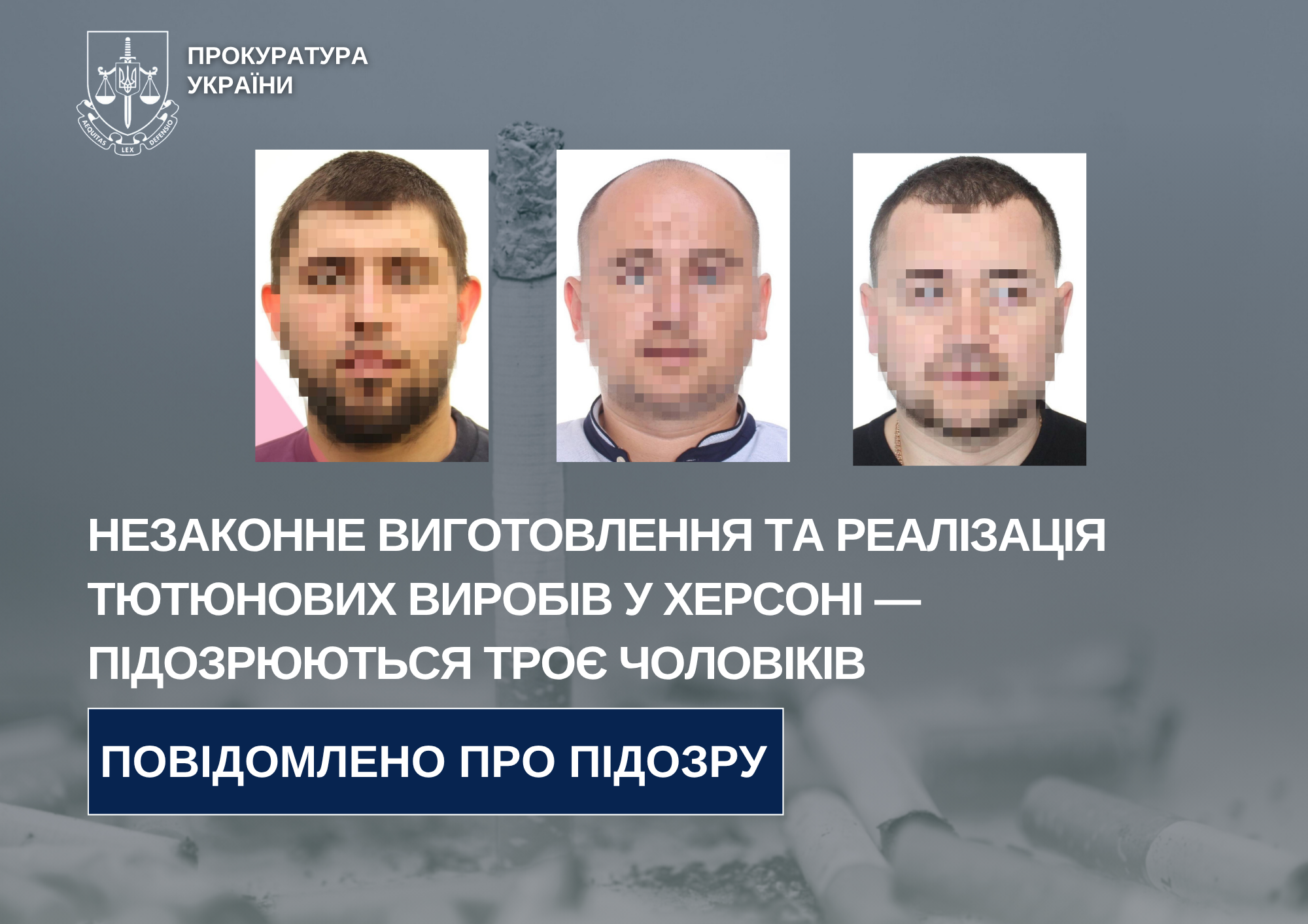 Під процесуальним керівництвом Херсонської обласної прокуратури трьом місцевим жителям повідомлено про підозру у незаконному придбанні, зберіганні та збуті незаконно виготовлених тютюнових виробів, вчинених за попередньою змовою.