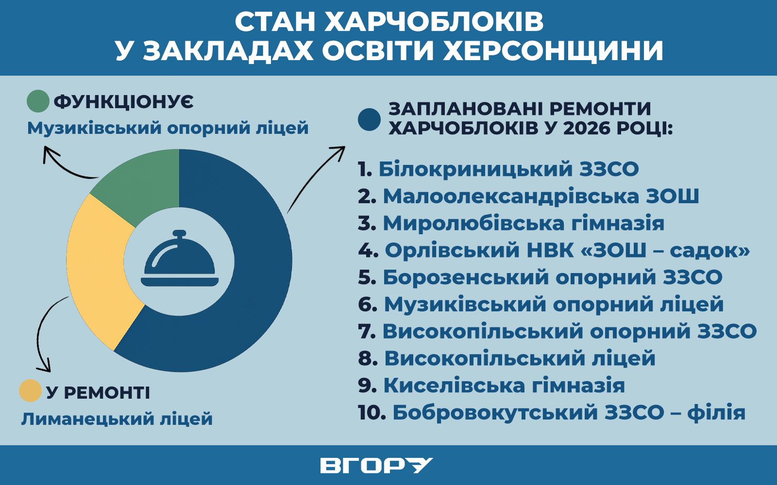 У Херсонській області почали оновлювати харчоблоки шкіл: один вже працює, а в іншому триває капітальний ремонт. Цього року розроблено проєктно-кошторисну документацію для модернізації 10 харчоблоків за моделлю «базова кухня».
