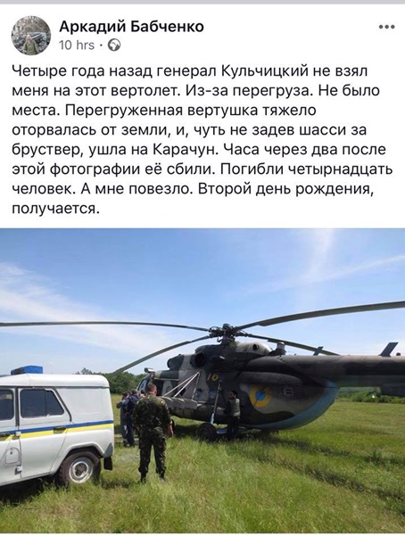 В своем последнем сообщении в Facebook Аркадий Бабченко вспомнил о катастрофе с вертолетом, который сбили над небом на Донбассе в 2014 году.