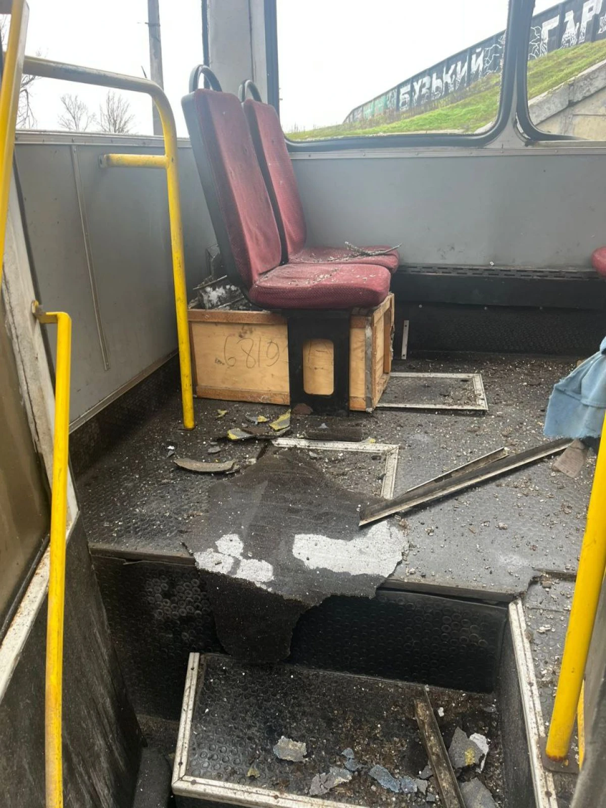 ОНОВЛЕНО: У Головному управлінні ДСНС у Херсонській області повідомили, що боєприпас влучив у проїжджу частину дороги, автобус пошкодило уламками. Тіло загиблого водія деблокували рятувальники.