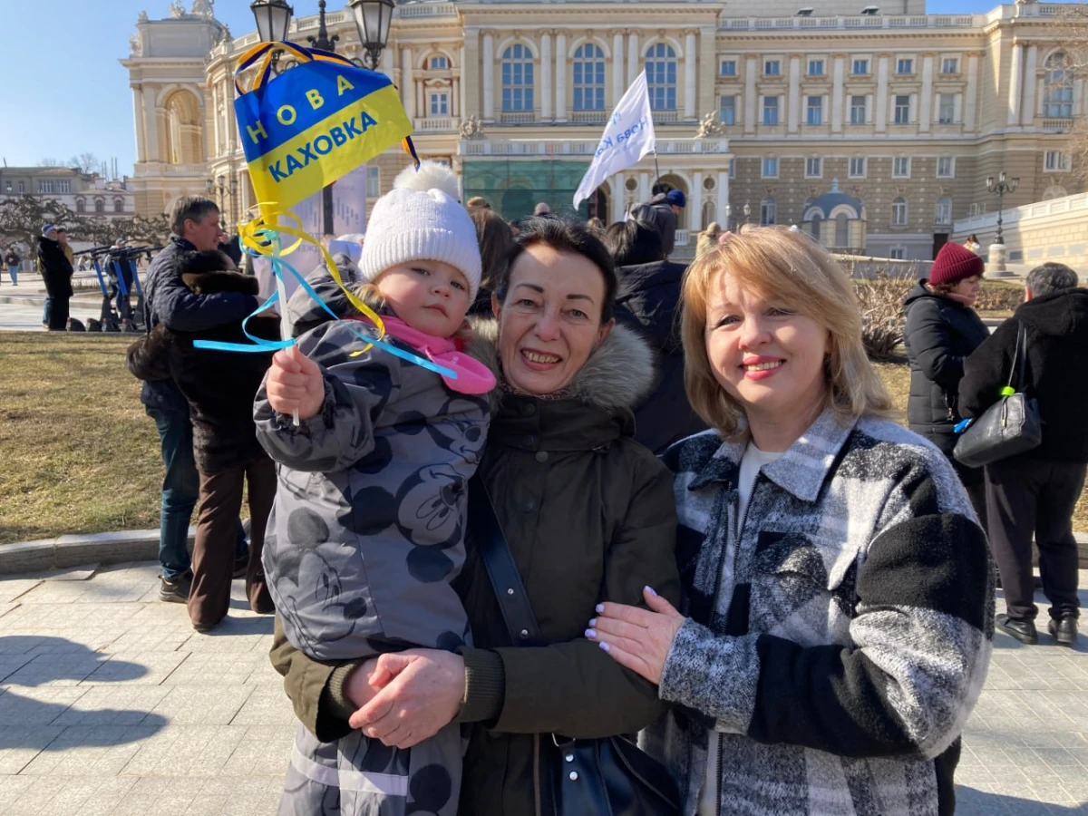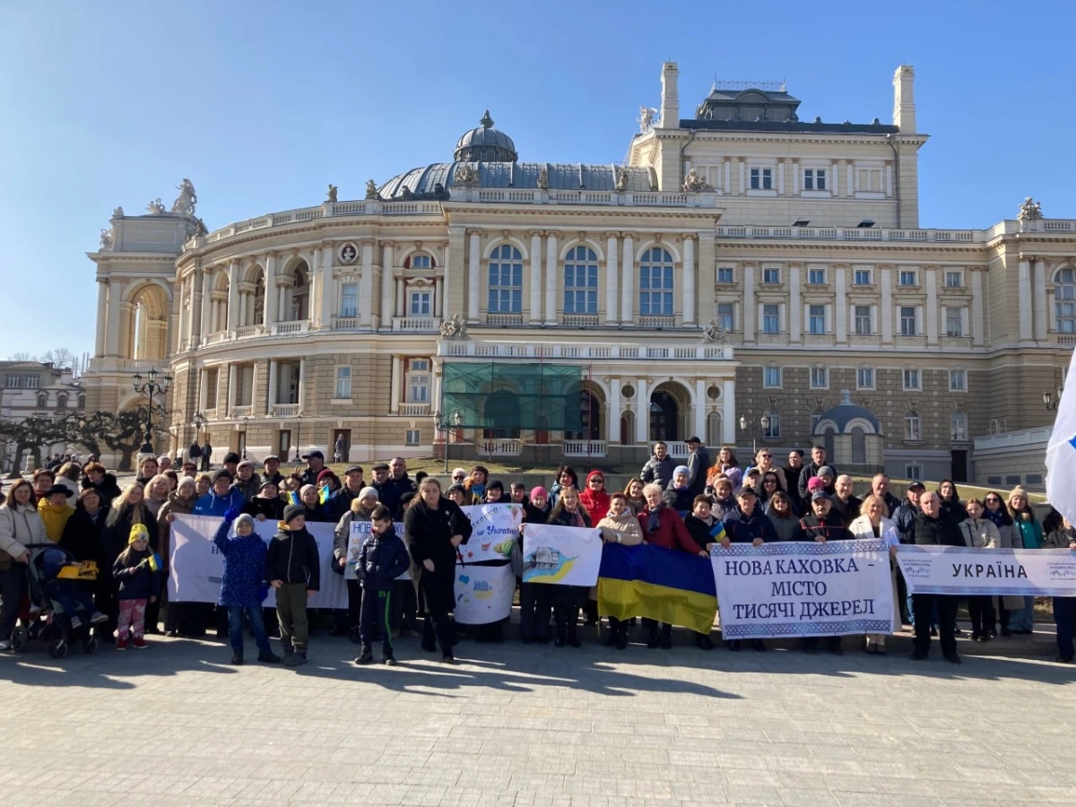 Близько сотні людей збирались 28 лютого 2026 року біля оперного театру в Одесі на акцію "Нова Каховка — це Україна". Захід був присвячений дню міста, яке нині перебуває під російською окупацією.