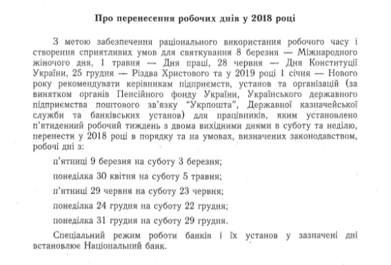 Зазначається, що ці дні перенесли для раціонального використання робочого часу та створення сприятливих умов для святкування Міжнародного жіночого дня (8 березня), Дня праці (1 травня), Дня Конституції України (28 червня), Різдва (25 грудня) і Нового року (1 січня 2019 року).