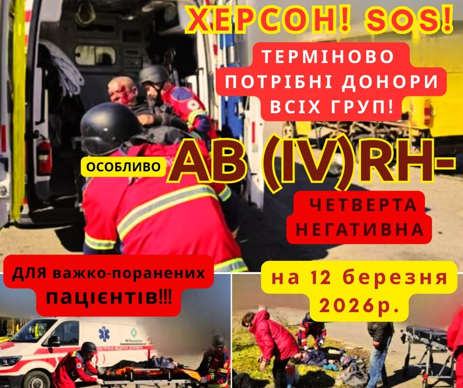 Херсонський обласний центр служби крові гостро потребує донорів крові на 12 березня 2026 року.