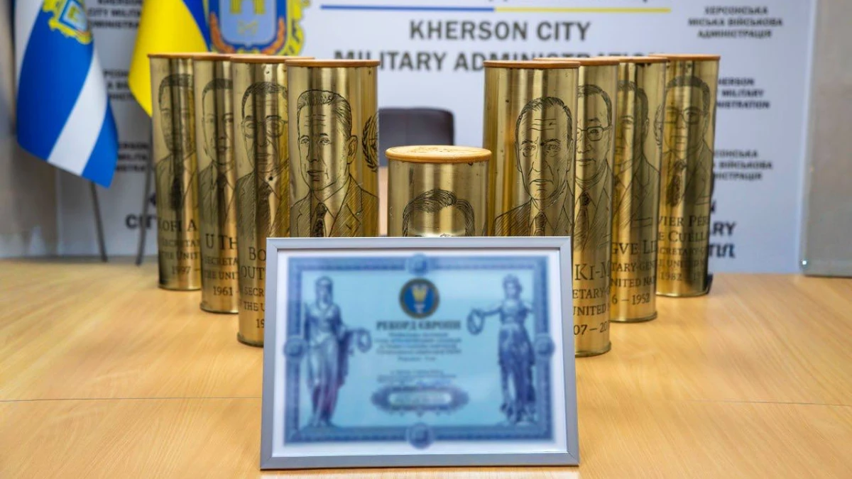 На Херсонщині створили 9 артилерійських гільз із гравійованими портретами генеральних секретарів ООН.