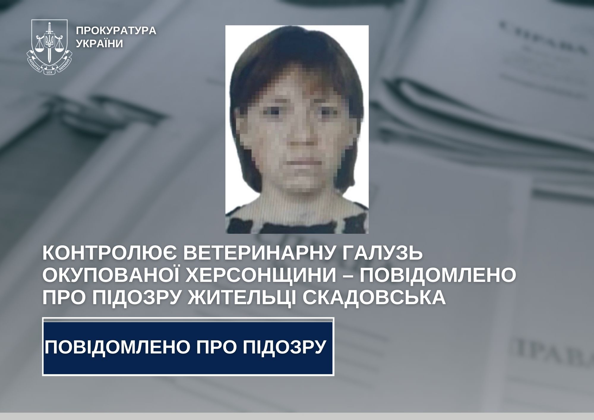 Йдеться про 43-річну жінку, яка у березні 2024 року обійняла посаду незаконного заступника начальника Управління ветеринарії Херсонської області. Цей орган діє на території тимчасово окупованого Скадовська.