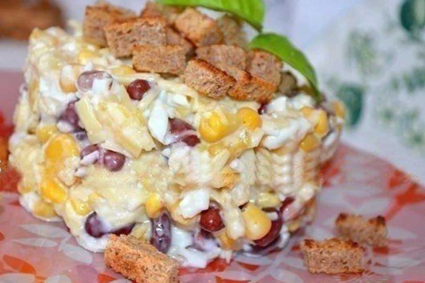 Салат с фасолью, сыром и сухариками