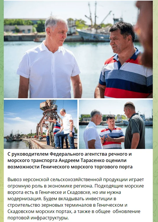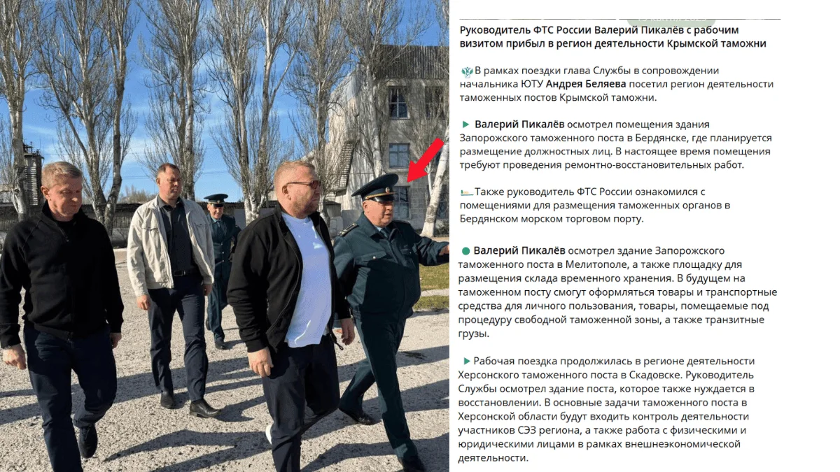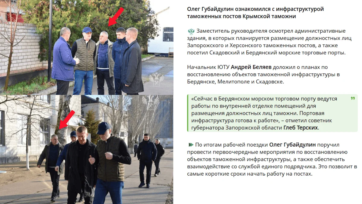 Вже у квітні того ж року Херсонський та Запорізький окупаційні митні пости відвідав начальник Федеральної митної служби Росії Валерій Пікалєв. Тоді очільник Південного управління Бєляєв доповідав йому, що об’єкти митної інфраструктури відновлюватимуть у Скадовську, Бердянську та Мелітополі. На фото з офіційного каналу служби у складі делегації знову Дмитро Афанасіаді.