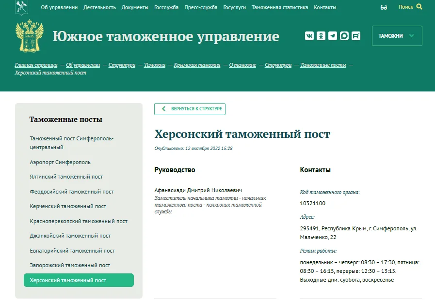 Виявилося, Афанасіаді повернувся до митниці – проте до окупаційної. В інформації на сайті Південної митниці Федеральної митної служби Росії він зазначений керівником Херсонського митного посту та заступником очільниці незаконної Кримської митниці Тетяни Кравець.