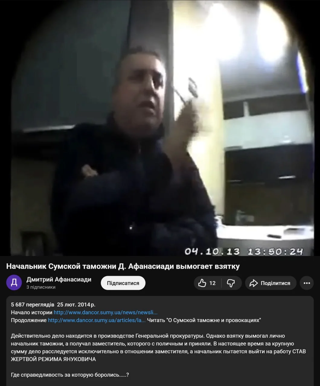 Деякі публікації припускали, що Афанасіаді міг уникнути відповідальності, «підставивши» заступника, але офіційно це не підтверджувалося. При тому доступно відео - запис із прихованої камери, датований 4 жовтня 2013 року, на якому зафіксовано розмову між двома чоловіками у службовому кабінеті, в одному з яких впізнається Дмитро Афанасіаді. Цей запис позиціюється як доказ вимагання хабаря. У розмові не вживається слово «хабар» прямо, проте контекст (обговорення «ставок», «завезення» грошей, згадка конкретних підприємств) вказує на обговорення корупційної схеми.