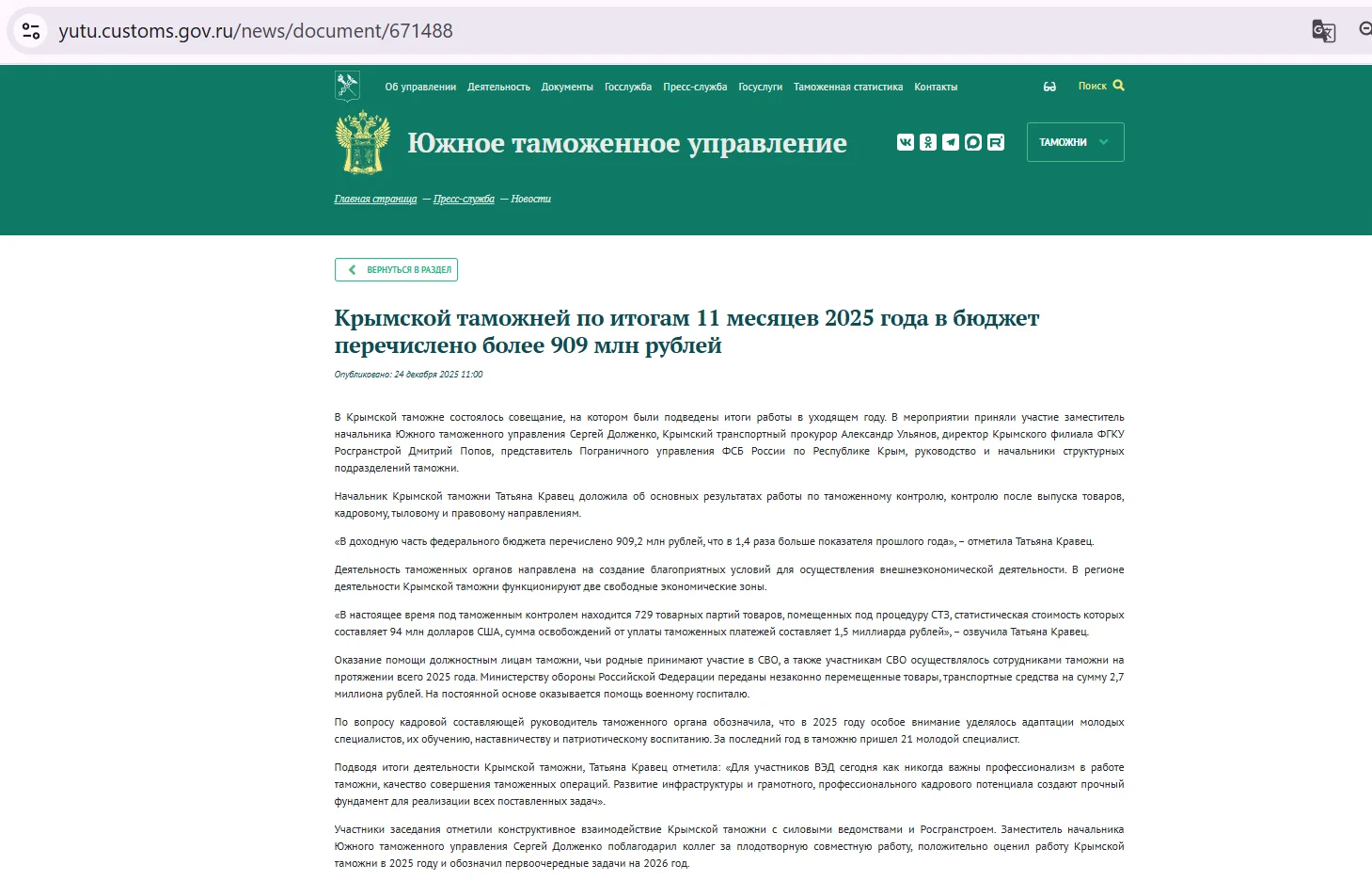 Кримська митниця наповнює бюджет РФ. Так, на сайті Південного митного управління розміщений звіт про діяльність Кримської митниці за 11 місяців 2025, у ньому зазначено, що вона переказала до російського бюджету понад 900 мільйонів рублів.