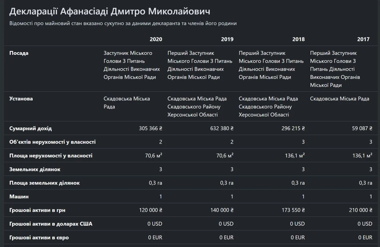 Майно Афанасіаді під час роботи в Скадовській міській раді (2017–2020) виглядає скромним для колишнього високопосадовця митниці та заступника міського голови: три, а з 2019 року два об’єкти нерухомості (один з них недобудова, один був проданий, про що свідчить Повідомлення про суттєві зміни в майновому стані, датоване липнем 2019 року), три земельні ділянки загальною площею 0,3 га, одна автівка (подарунок, оформлений на ім’я дружини у 2018 році), відсутність валютних накопичень, а грошові активи у гривні рік від року зменшуються (з 210 тис. грн у 2017-му до 120 тис. грн у 2020 році).