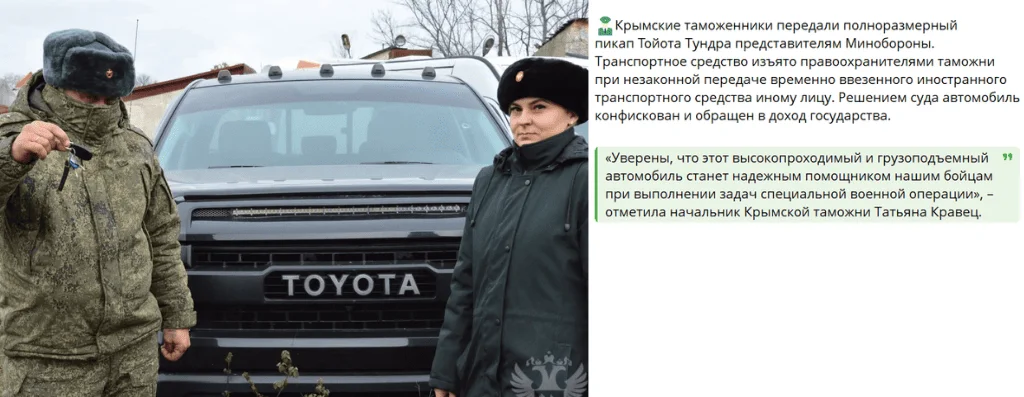 У січні 2026 року кримські митники передали конфіскований автомобіль Toyota Tundra представникам російського Міноборони. У повідомленні цитували керівницю Кримської митниці Тетяну Кравець, яка висловлювала «сподівання», що цей транспорт допоможе російським військовим під час виконання завдань у війні проти України.