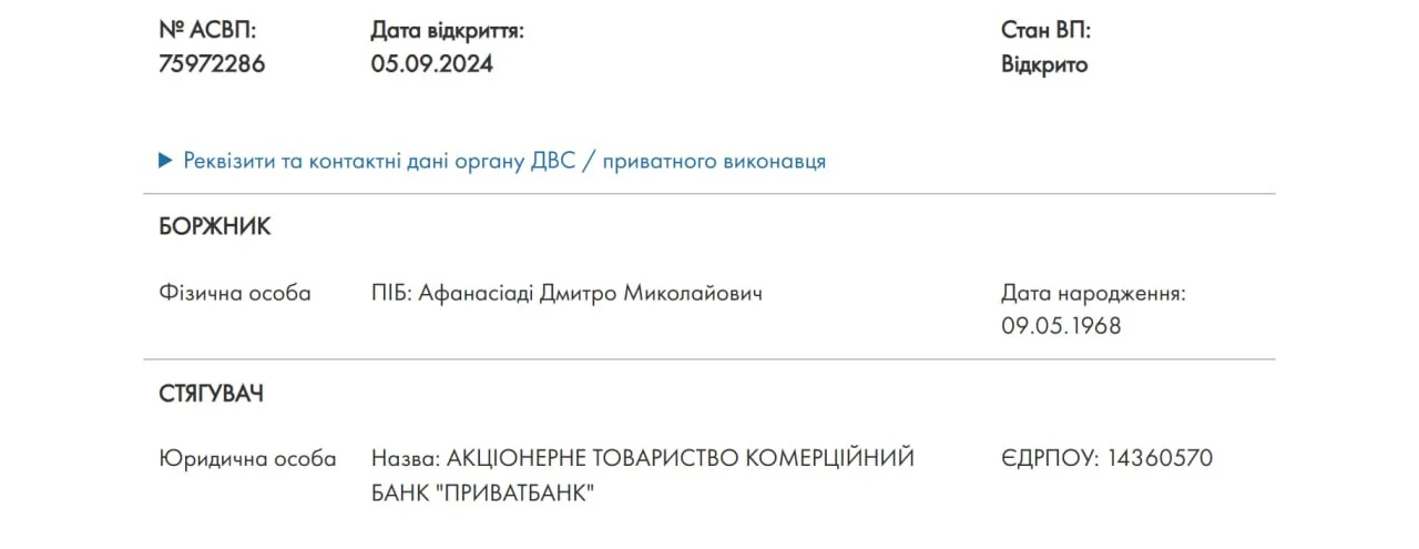 У 2019 році Дмитро Афанасіаді взяв кредит. Але він залишився невиплаченим – про це відомо з ухвали суду. На момент подачі позову у вересні 2023 року борг становив майже 118 тисяч гривень (з них з них 97 422,17 грн – тіло кредиту і 20 492,68 грн – прострочені відсотки). Позов ПриватБанку повністю задовольнили. По справі відкрито виконавче провадження.