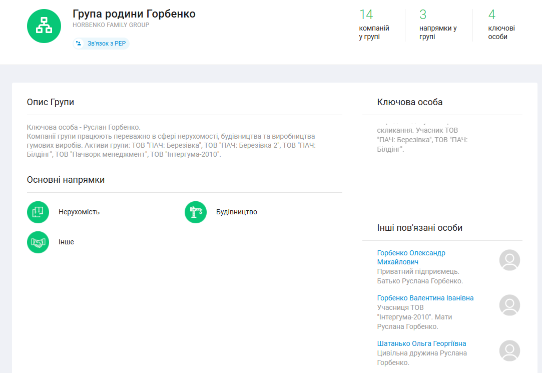 До пулу компаній родинної групи Горбенка входять сам Руслан Горбенко, його батьки Олександр та Валентина Горбенки, а також цивільна дружина нардепа Ольга Шатанько.