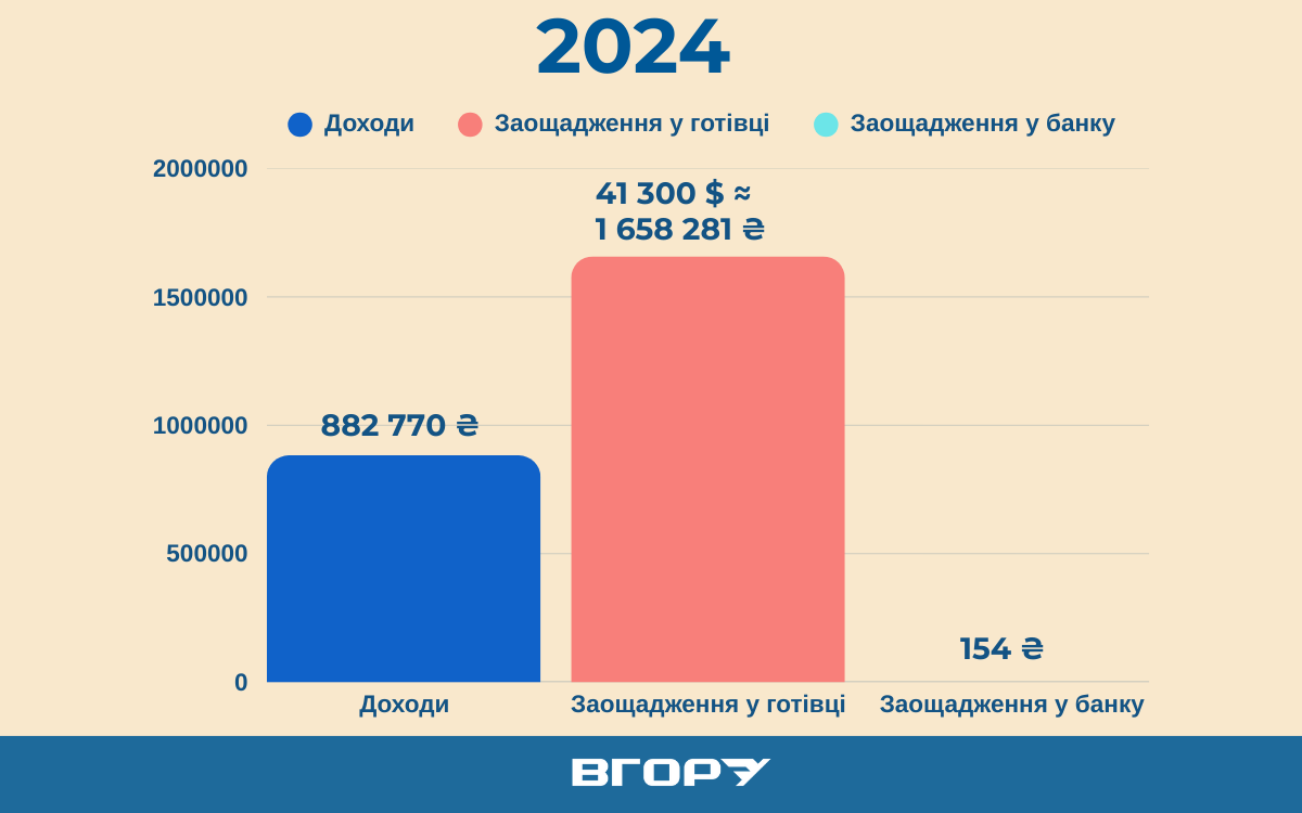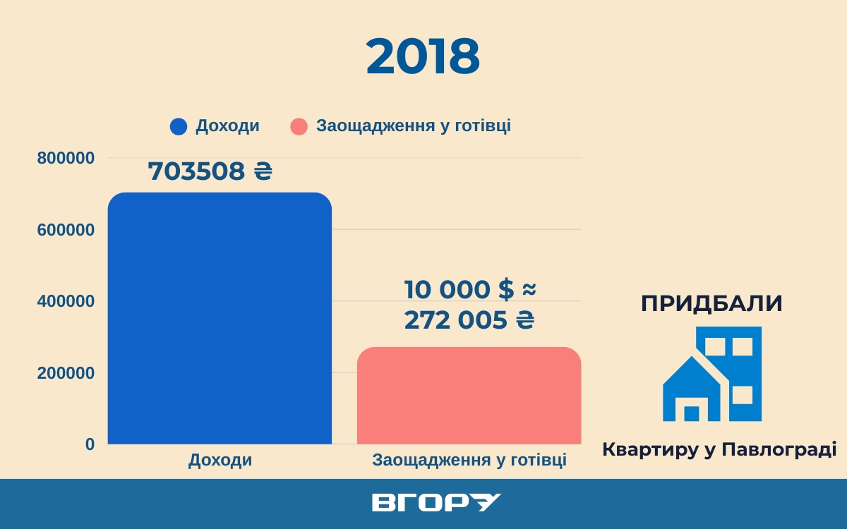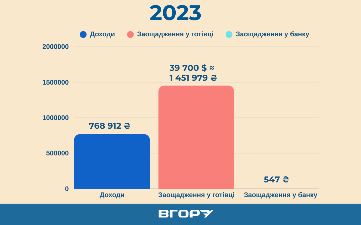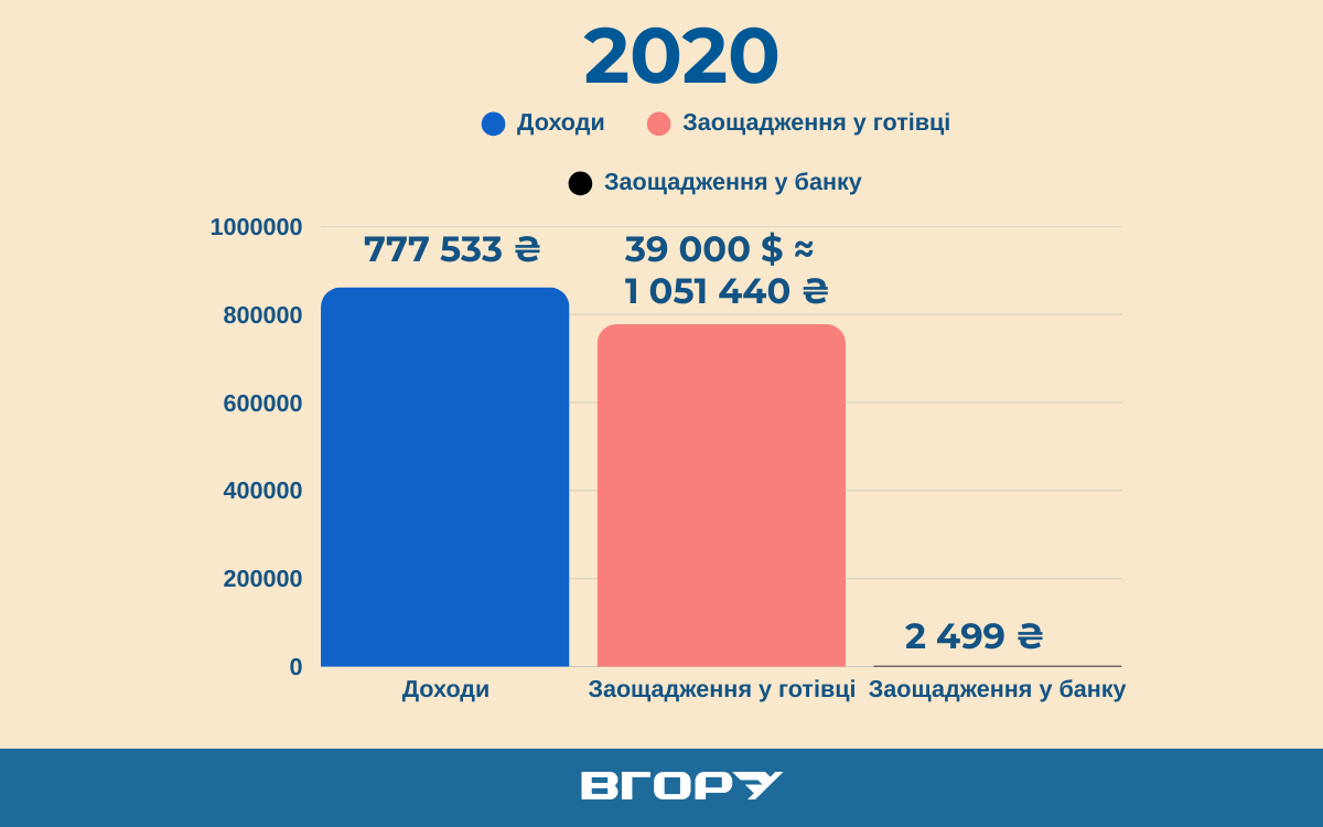 Готівка в доларах США збільшилася до 39 тисяч (приріст – 17 тисяч), що у гривневому еквіваленті Середньорічний курс гривні до долара США у 2020 році становив 26,96 гривні за 1 долар США. становило понад 1 млн 51 тисячу гривень. На банківському рахунку вони мали майже 2,5 тисячі гривень.
