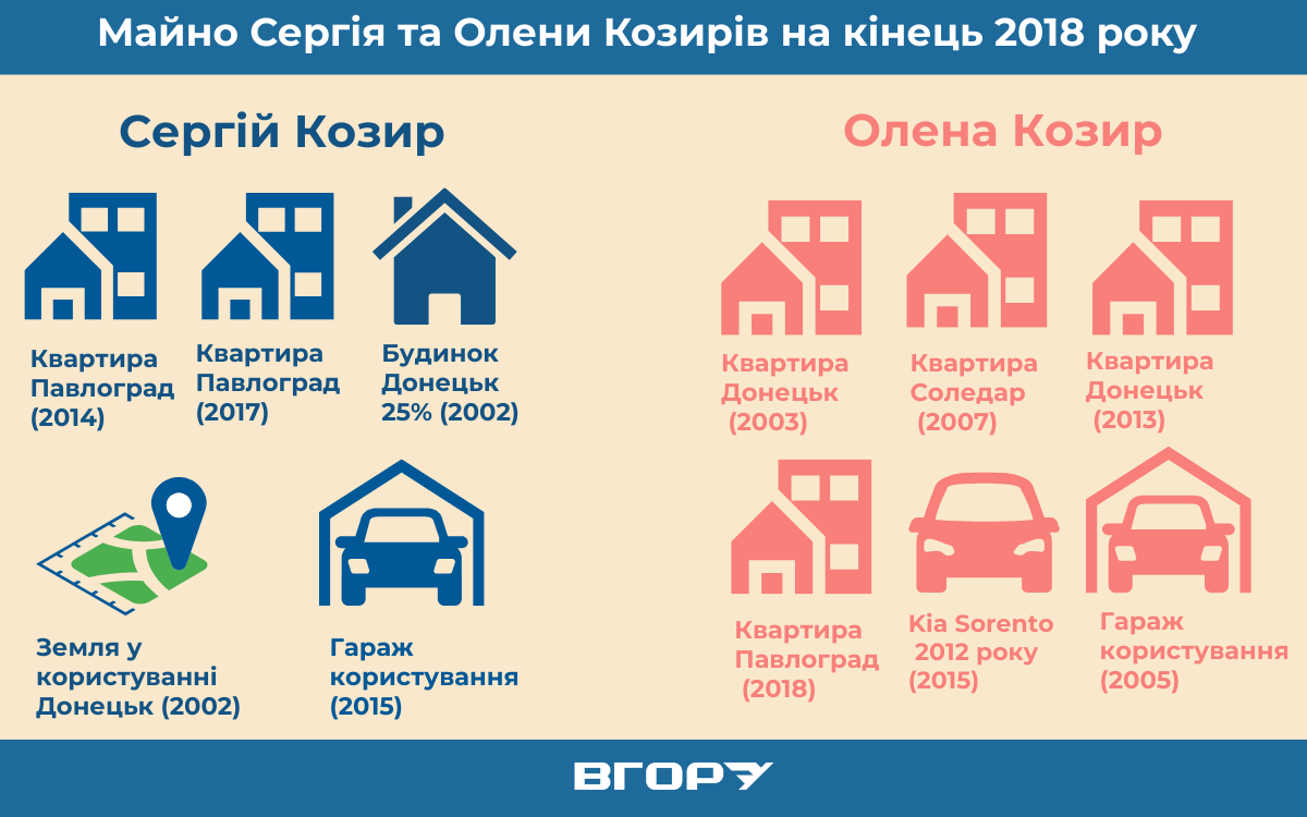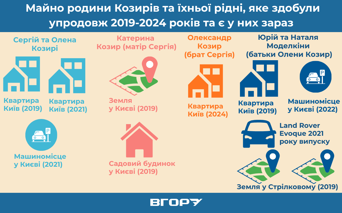 На інфографіці нижче – майно Олени та Сергія Козирів, матері, брата та тестя з тещею Сергія, яке здобули від 2019 року – з року отримання посади у Херсонській ОДА і по сьогодні.