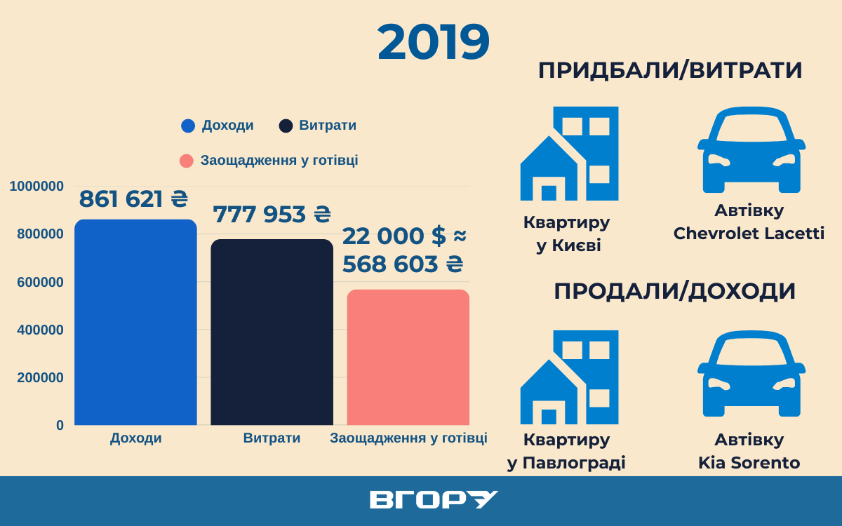 Забігаючи наперед, додамо, що попри витрати на нові квартиру, автівку і судову тяганину з колишньою дружиною (про це – далі), у 2019 році родині Козирів вдалося збільшити доларові заощадження – на кілька тисяч, походження яких незрозуміле.