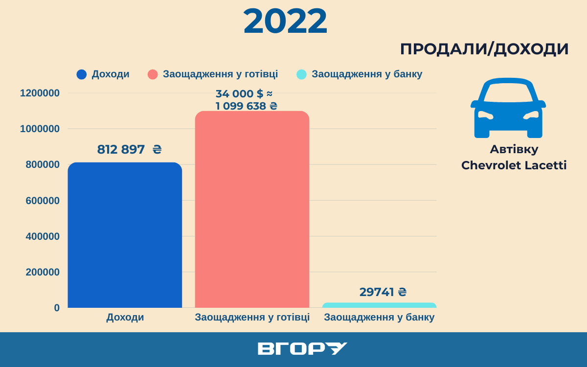 Також у 2022 році продали автівку Олени. За Chevrolet Lacetti по середньорічномуСередньорічний курс гривні до долара США у 2022 році становив 32,3423 гривні за 1 долар США. курсу НБУ на 2022 рік вторгували майже 7 тисяч доларів США. У декларації зазначили, що власником цієї автівки став Олександр Козир – імовірно, брат нардепа.