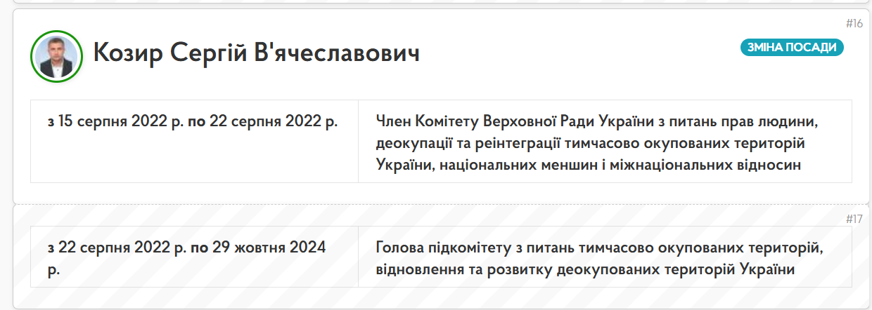 З 15 серпня 2022 року і до 29 жовтня 2024 року Сергій Козир також був у цьому комітеті: спочатку як член комітету, а з 22 серпня 2022 року головою підкомітету з питань тимчасово окупованих територій, відновлення та розвитку деокупованих територій України.