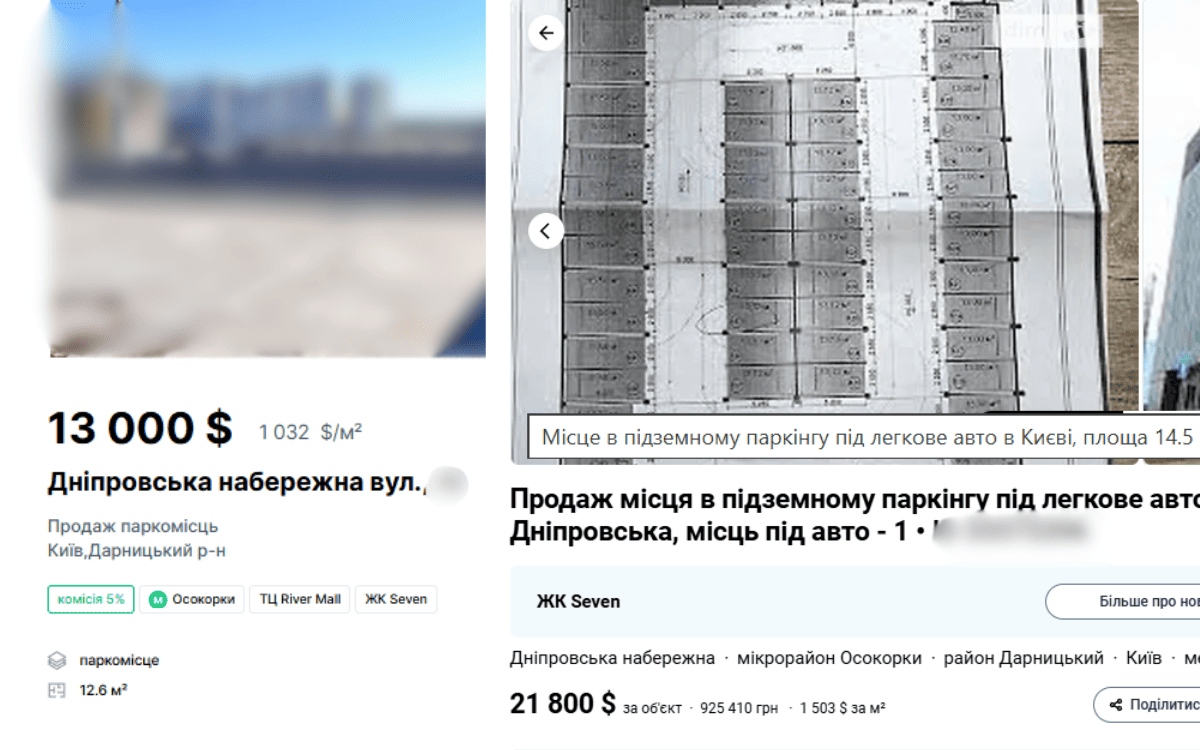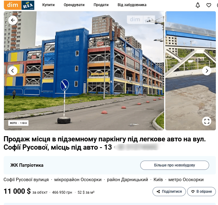 Скриншот з сайту Dim.ria. Ціна на паркомісце на вулиці Софії Русової
